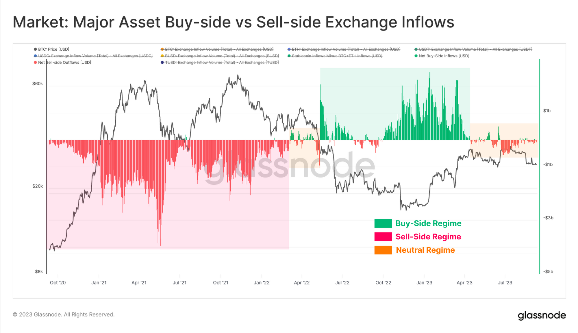 - We assume the USD value of BTC and ETH flowing into exchanges is a proxy for 'sell-side' pressure.