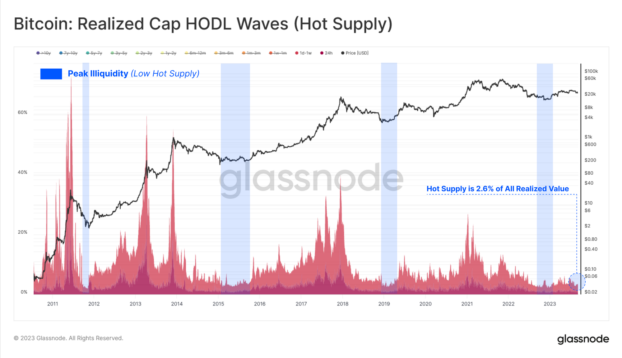 We can also track this on-chain illiquidity and apathetic sentiment by observing the proportion of wealth held in the most active and liquid subsection of the market, the ‘Hot Supply’ cohort (coins moved within the last week).