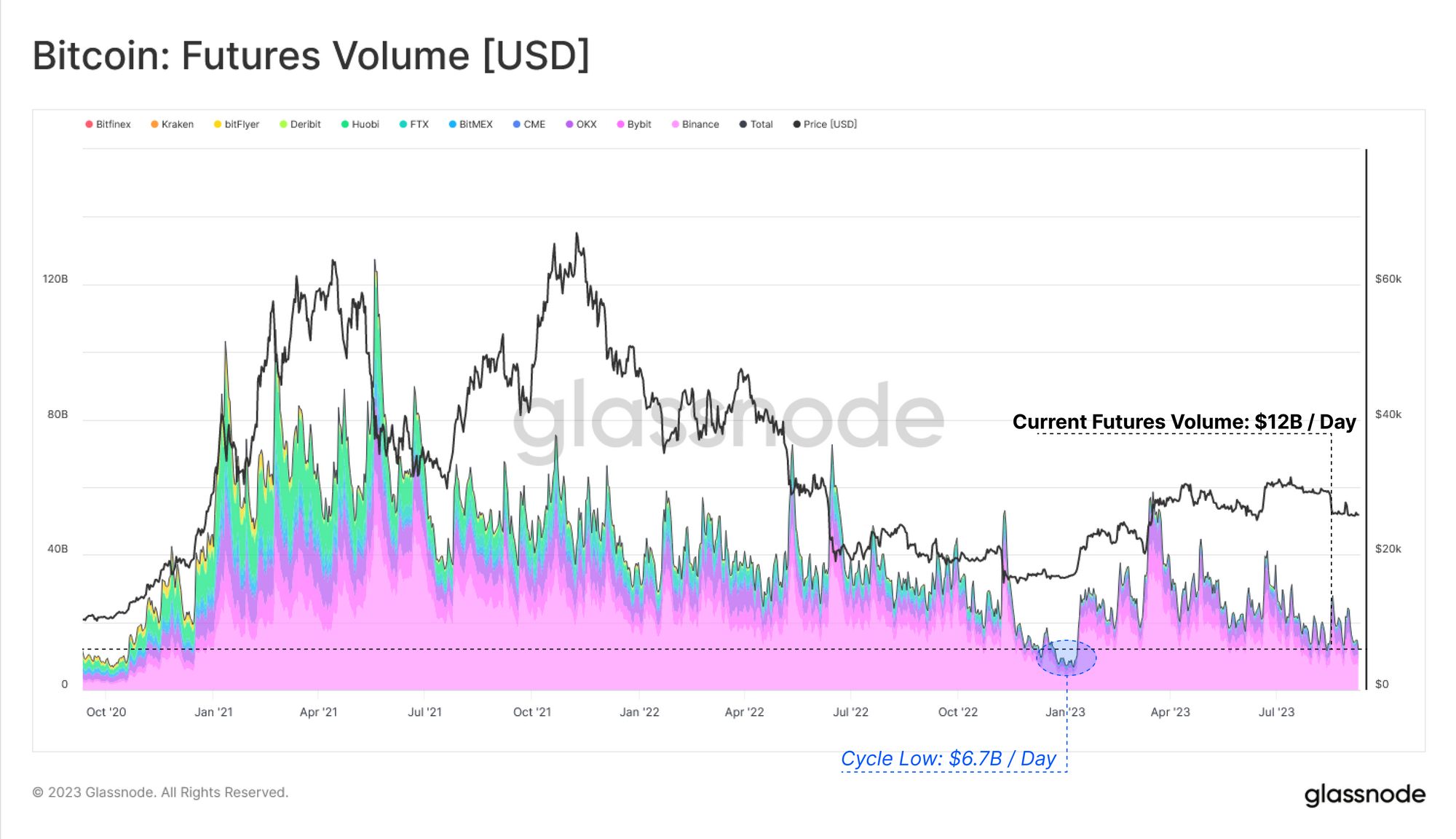 Moving across to off-chain derivatives markets, we can see that futures trading volumes have succumbed to a similar fate, hitting historical lows of $12B/day. The only period with lighter trade volume was the lull at the end of 2022, where the Bitcoin price traded within a $557 range for over two weeks (WoC 2).