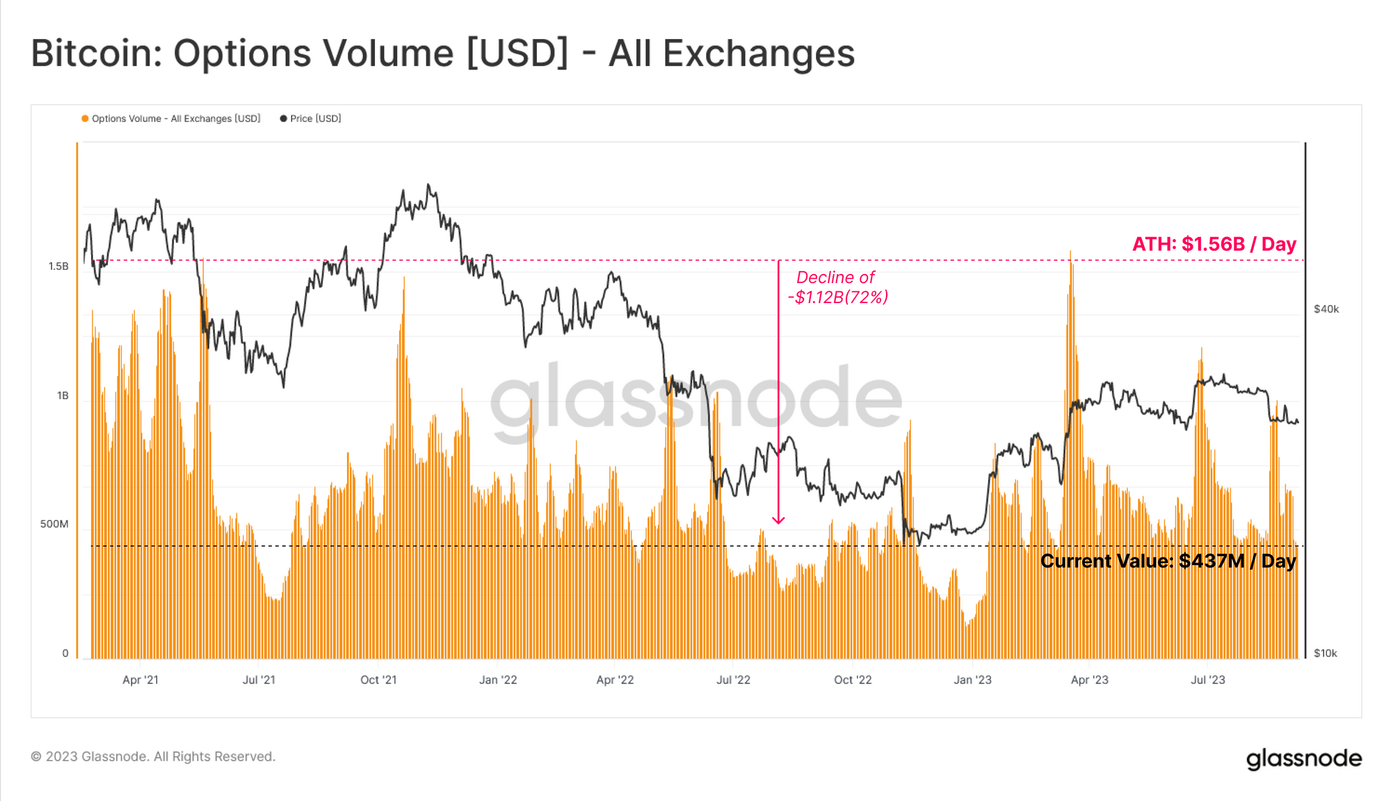 We have noticed an interesting divergence in Options markets however, where trade volumes have increased meaningfully in 2023, currently at $437M/day. This could be a reflection of the market preferring to use the leverage and capital efficiency of options to express their view during a period of tighter overall liquidity conditions.