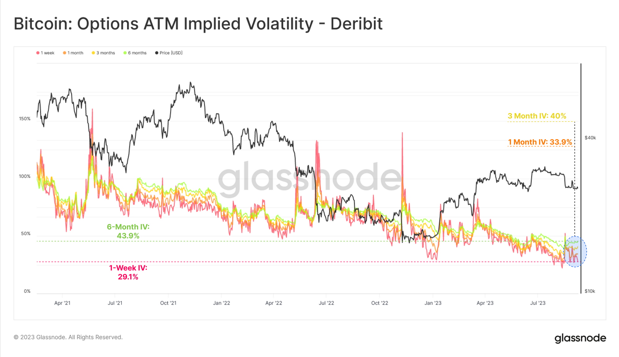 Despite the volatility spike experienced during the recent sell-off to $26k, and then again during following Grayscale's successful challenge of the SEC in the courts, Realized Volatility has remained remarkably low. The market is still in a historically low volatility environment, which is usually a precursor to heightened volatility down the road.