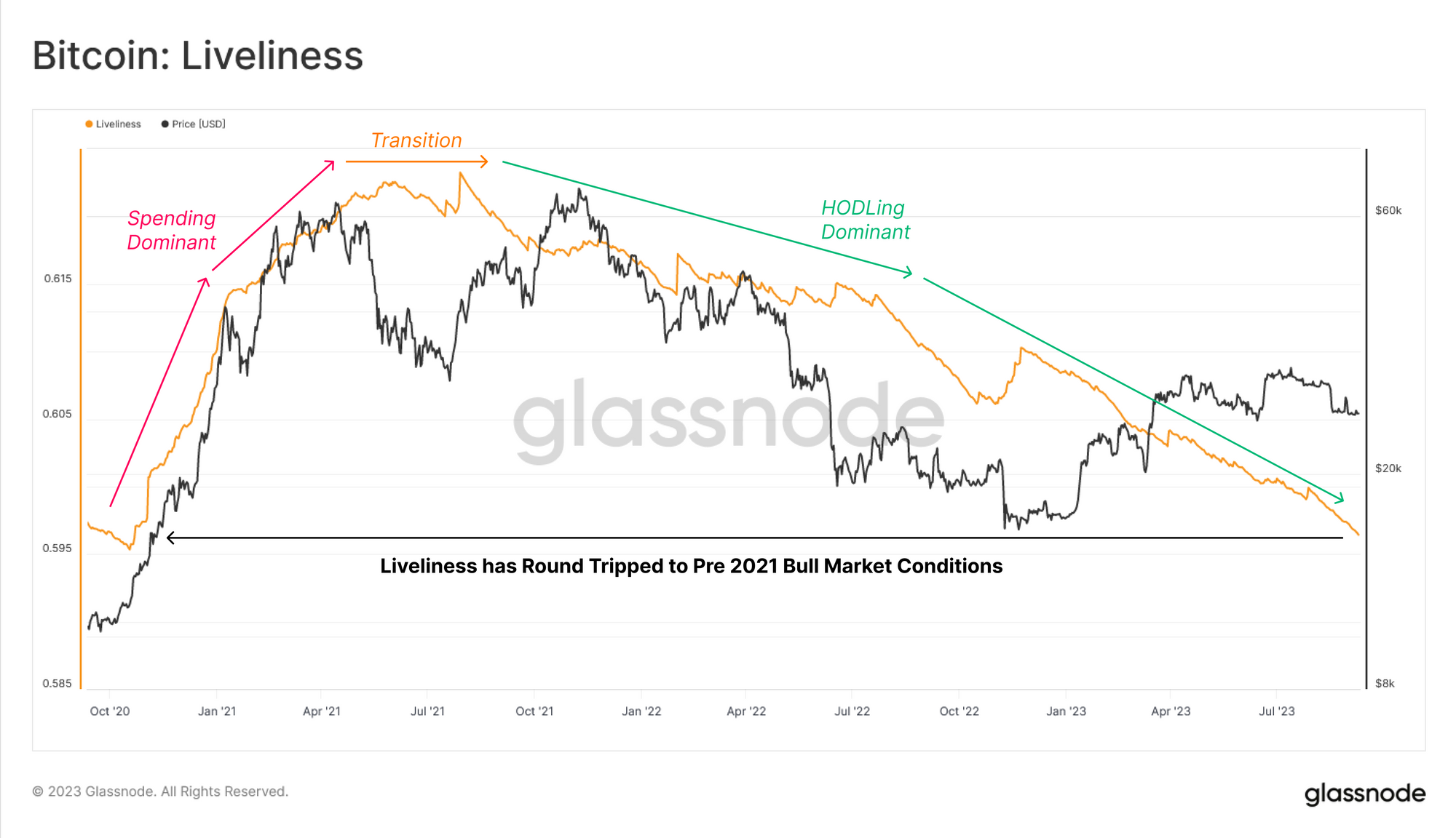 Liveliness has now reset to late 2020 conditions, and is seeing a progressively steeper downtrend. This indicates that aggregate 'investor holding time' is increasing, and investors are increasingly unwilling to spend and part with their held coins.