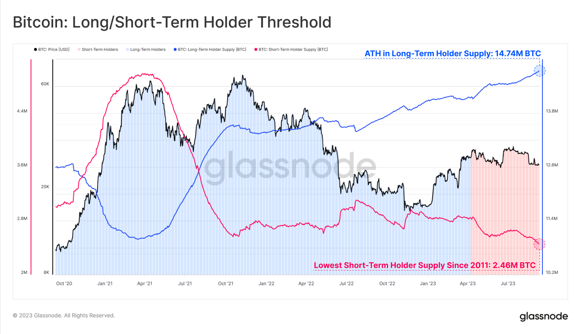 With both the on- and off-chain domains being exceptionally quiet, it is of no surprise that the supply held by the Long-Term Holder cohort has reached a new ATH of 14.74M BTC. Conversely, the supply held within the Short-Term cohort, representing the more active portion of the market, has fallen to the lowest supply held since 2011.