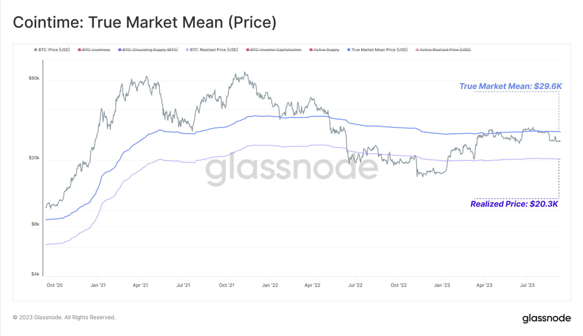 A key insight from this work was the development of the True Market Mean price, which we argue is the most accurate 'cost basis' model for active Bitcoin investors. This model is currently located at $29.6k, and has formed a psychological resistance level since April of this year. The traditional Realized Price is trading at $20.3k, with both models bounding much of the years price action.