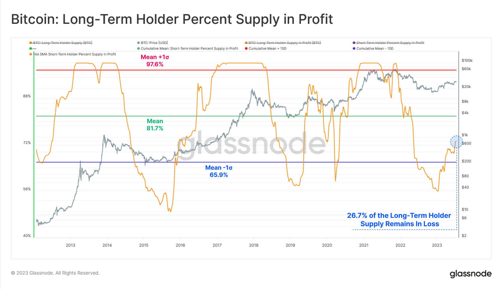 For the Long-Term Holder cohort, their profitability is gradually increasing, although is still historically low, and has only left the minus one standard deviation band a few months ago. Whilst this is a constructive trend, over 26.7% of LTH supply is underwater relative to their acquisition price, and well below the all-time-mean.