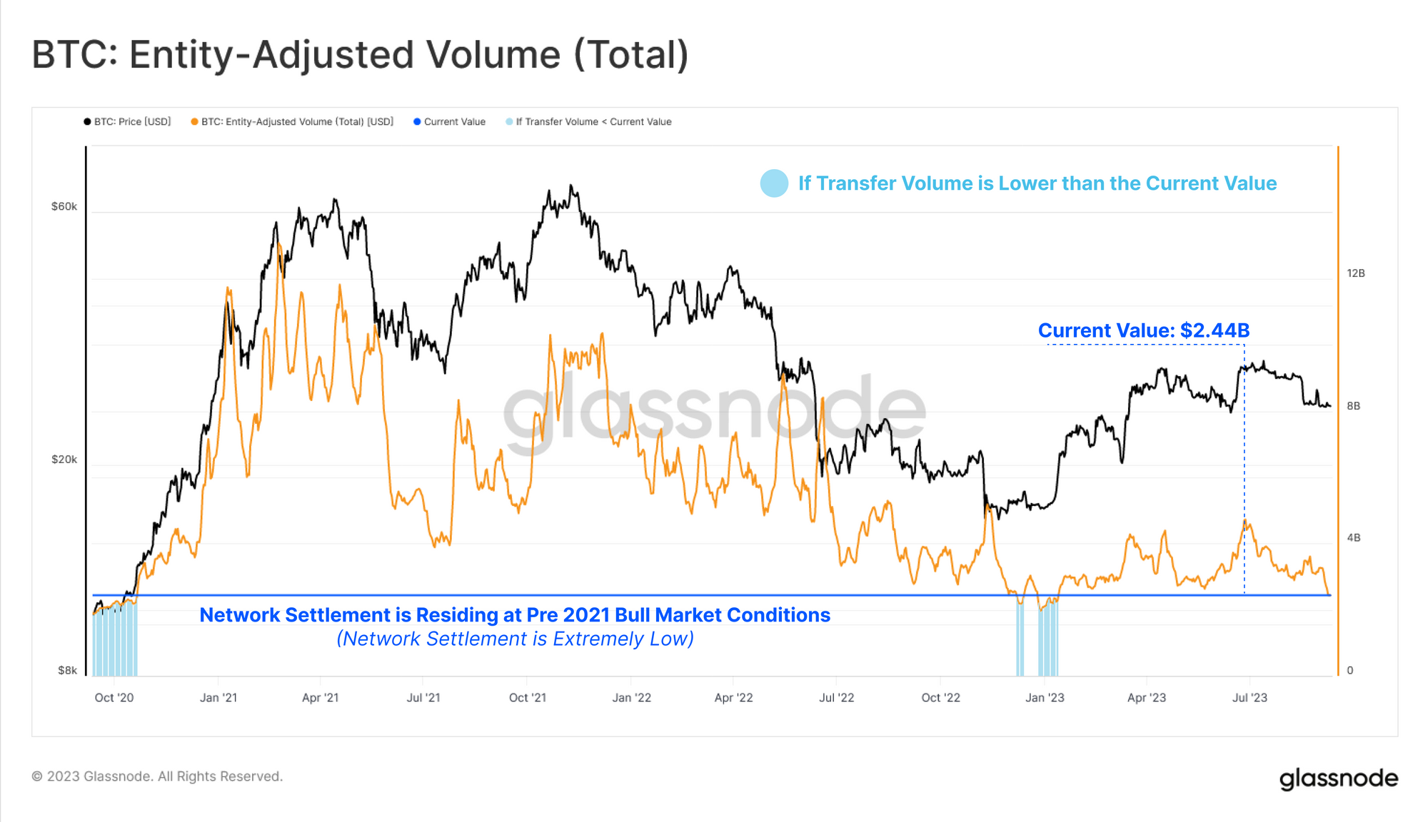 This low liquidity and low volatility environment is also reflected across Bitcoin network settlement volumes. The total USD volume of coins changing hands (using our entity-adjustment clustering) is languishing around cycle lows of $2.44B/day, and has returned to October 2020 levels.