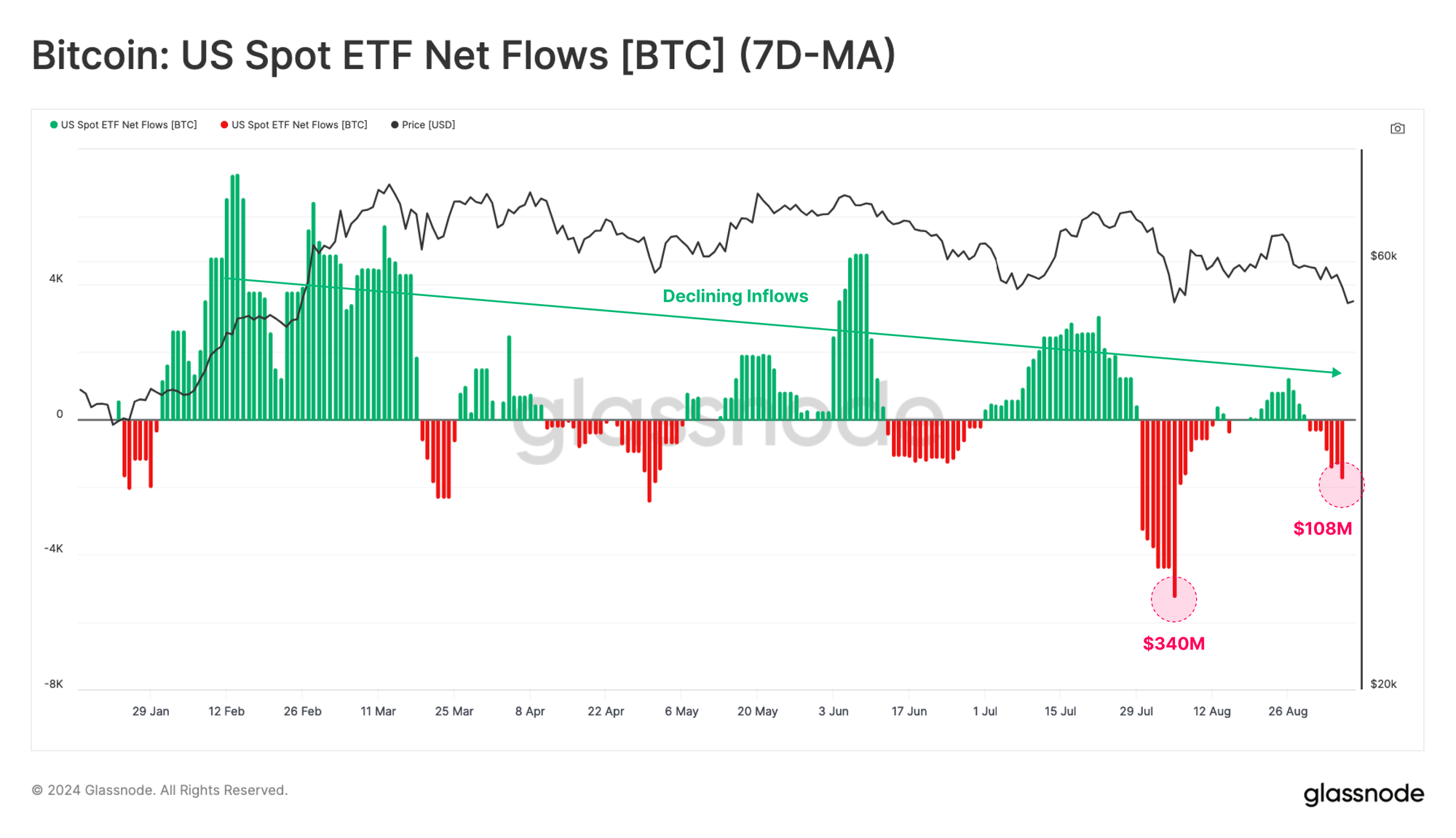 Starting with the Bitcoin ETFs, we can see that net capital flows in USD have softened since Aug 2024 and are now reporting an outflow of $107M/week.