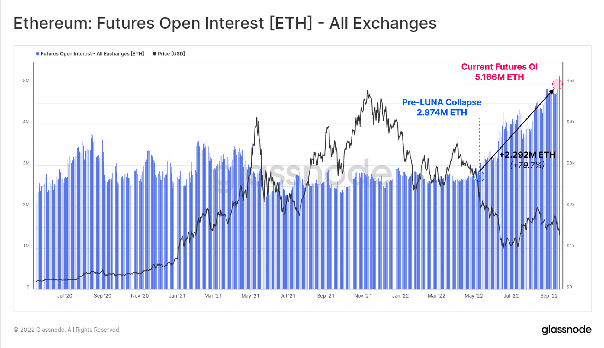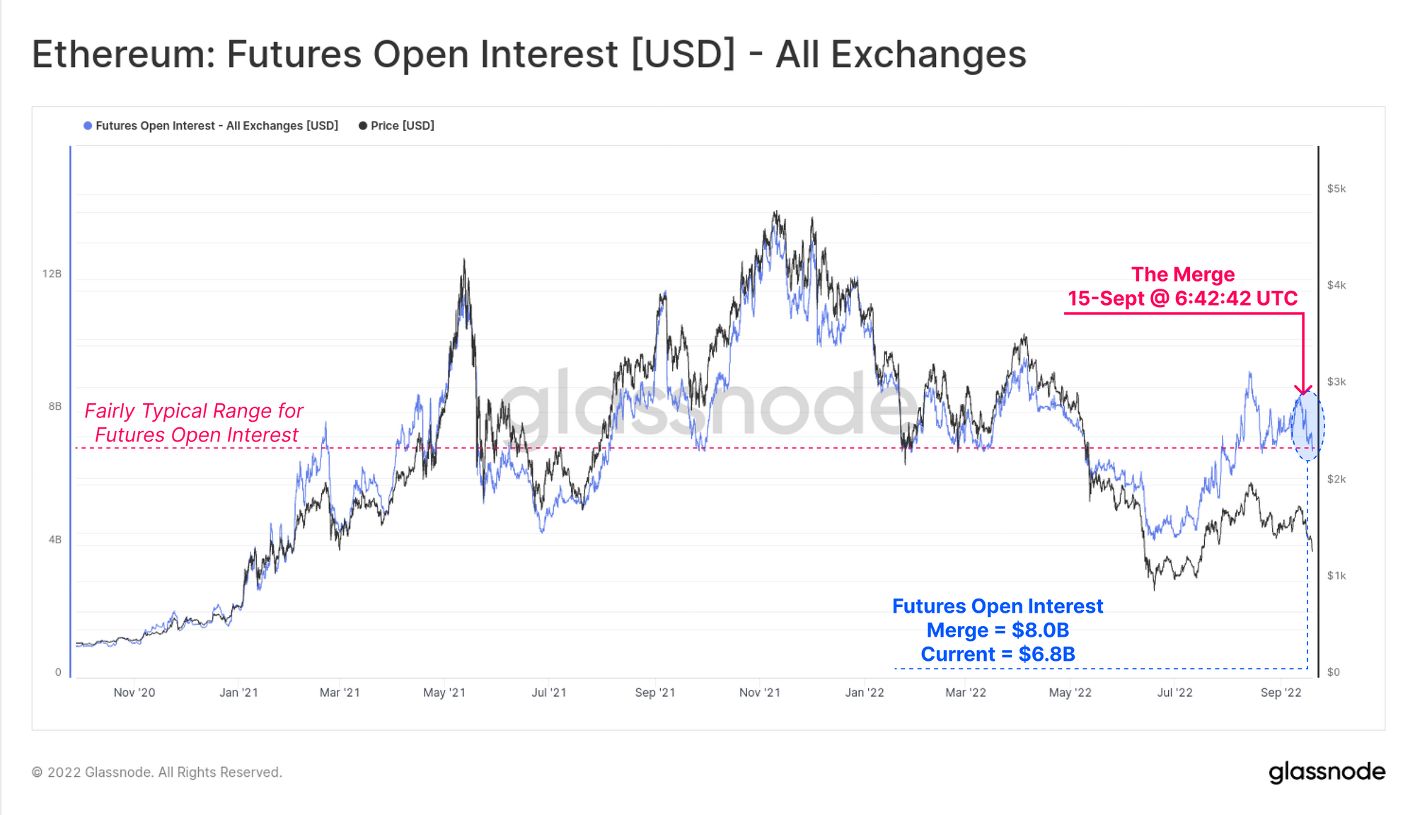Total Futures Open Interest declined by 15% from $8.0B to $6.8B after the Merge, with both of these extremes being fairly typical in the context of 2021-22 markets. However, to keep this change in context, we must account for the influence of a changing ETH coin-price, which affects the USD value of ETH-denominated futures position sizes.