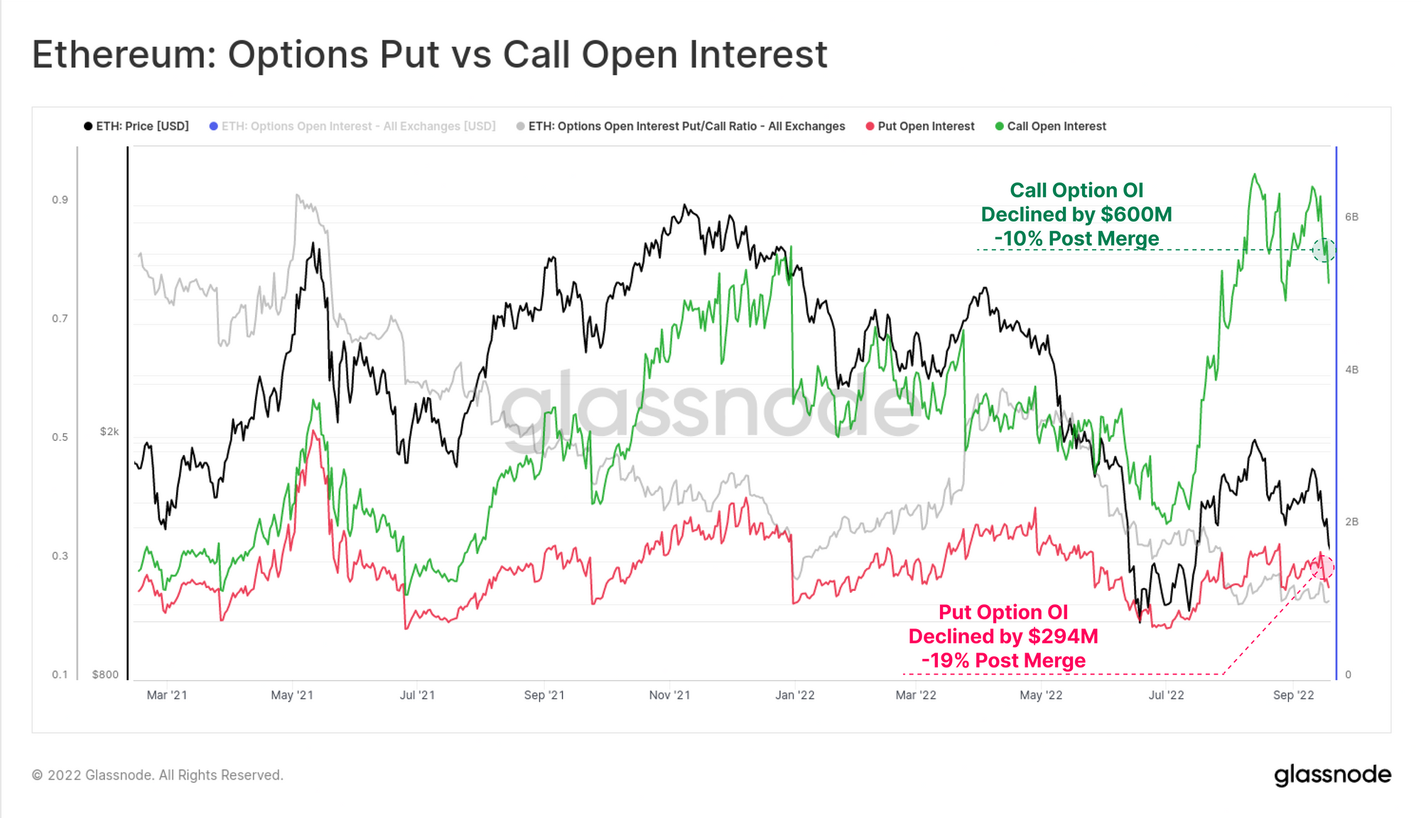 In options markets, where a large amount of recent ETH speculation took place, Call option Open Interest has declined by $600M post-Merge (a 10% decline). There remains a total of $5.2B in outstanding call option position value, which is still much higher than 2021 norms. Put option markets experienced a more significant relative drop of 19%, but this remains a much smaller scale $294M in net position value closed.