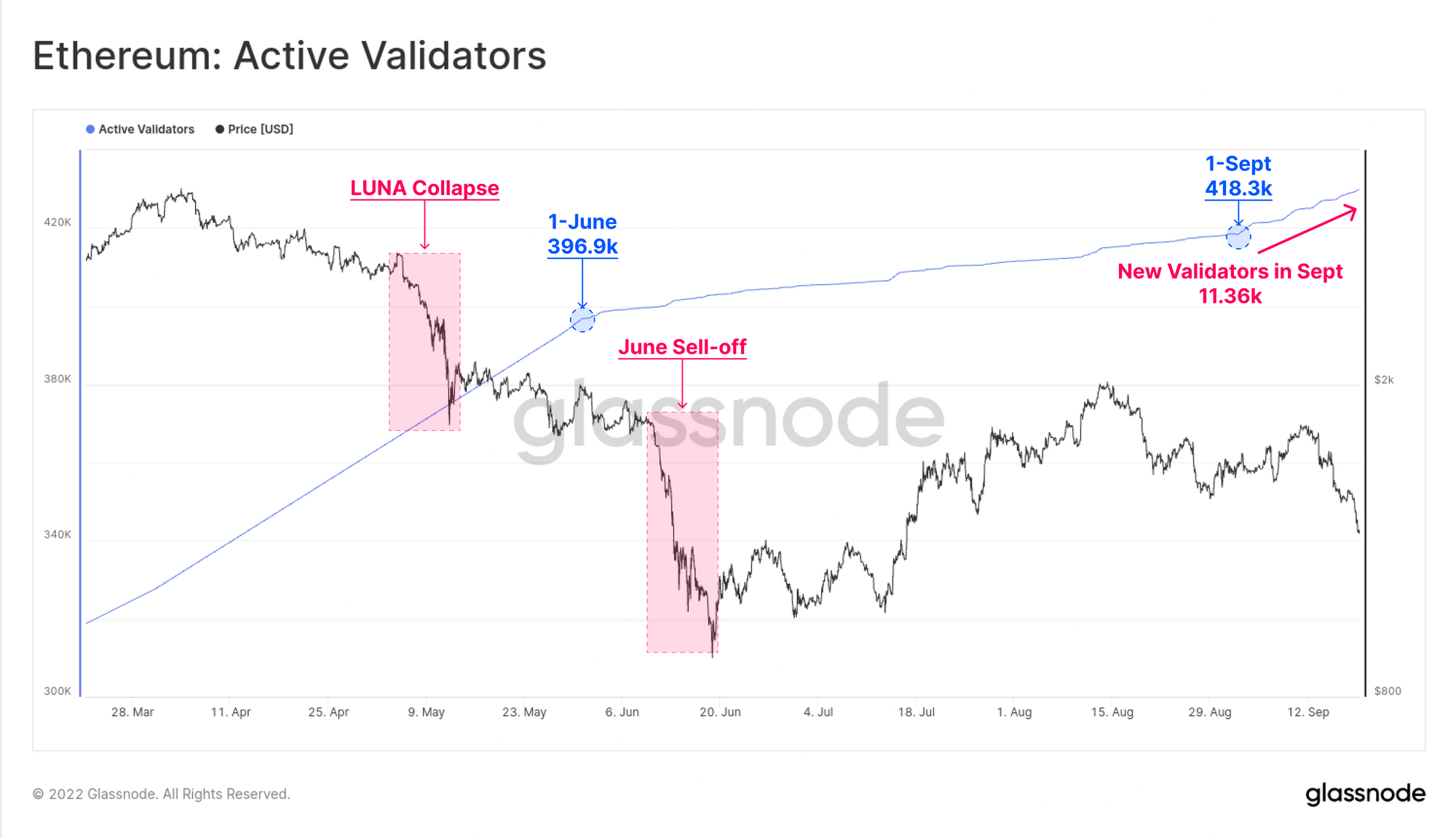 Ethereum currently has over 429.6k Active Validators on the network. The chart below shows the last 6-months, where the gradient of new validators can be seen to increase markedly in the lead up to, and following the Merge. Over 11.36k Validators have come online in September alone, signifying a growing investor confidence as the technical challenges of the Merge are de-risked.
