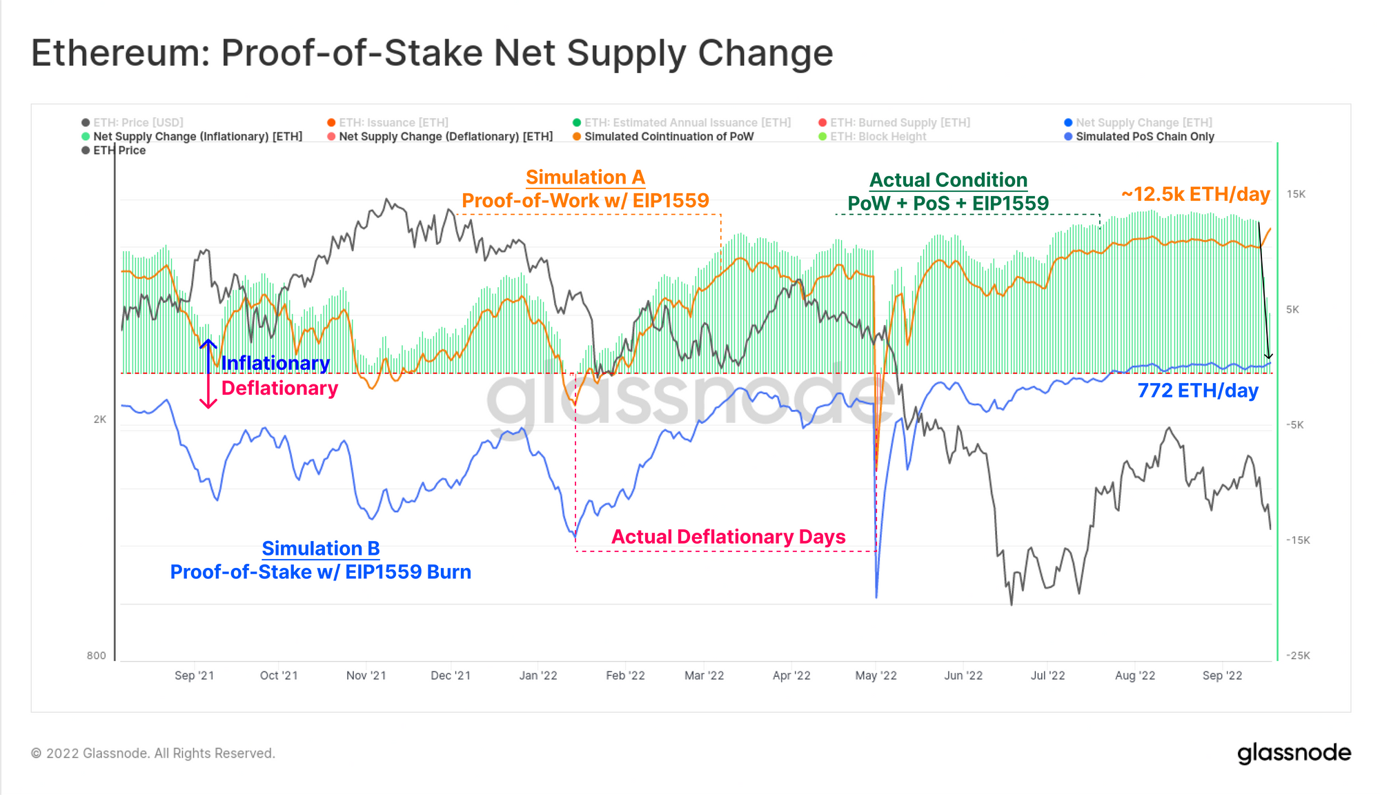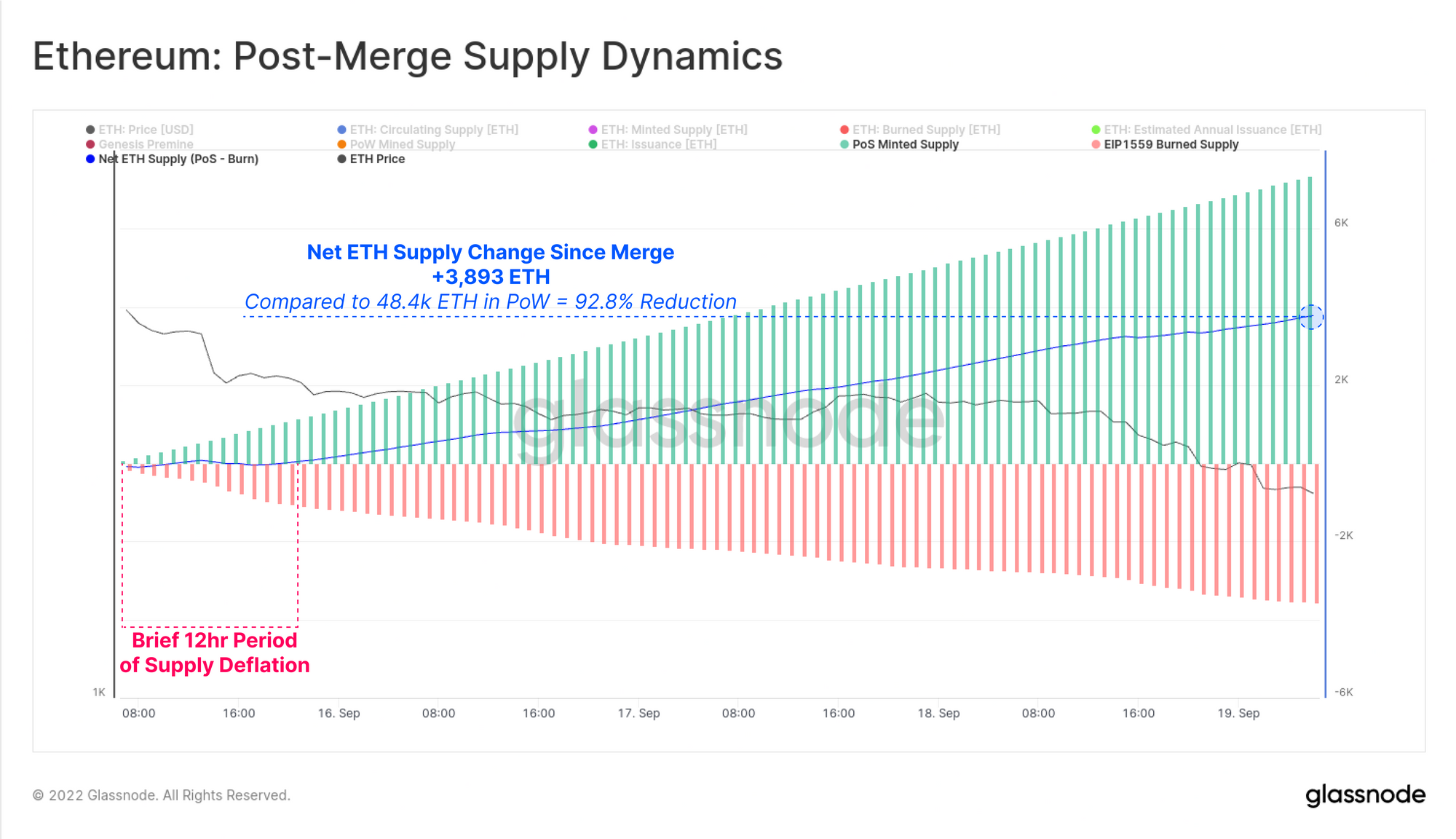 Zooming into the 1-hour chart from the Merge event onwards, we can calculate the net supply reduction that has taken place. Between the Merge and the time of writing (~4-days after the fact):