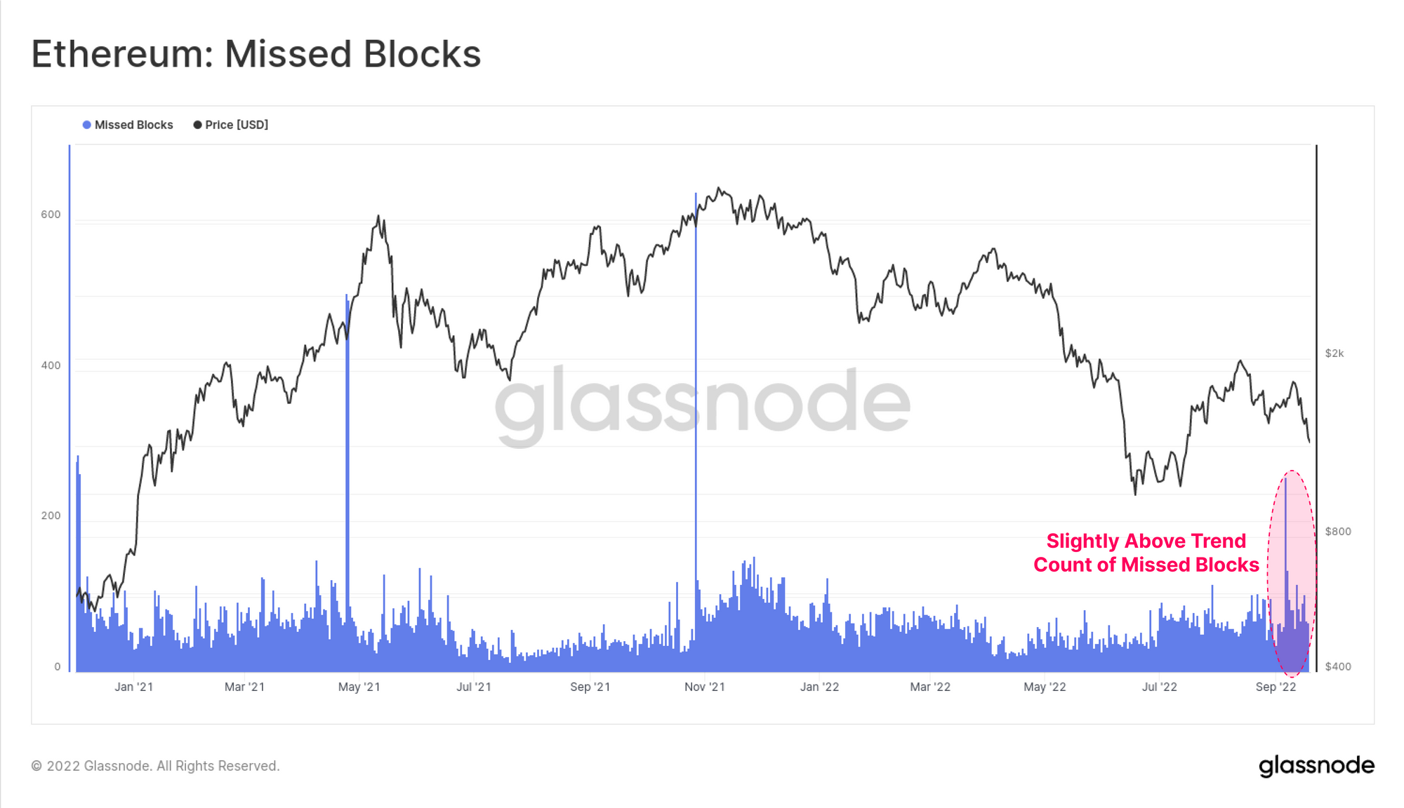In the weeks leading up to the Merge, a slight decline in Participation Rate can be observed, falling below the typical 99% level to around 97.5%. Post-Merge, this has reverted back into the 99%+ range, suggesting only a brief disruption to some sub-set of validators.
