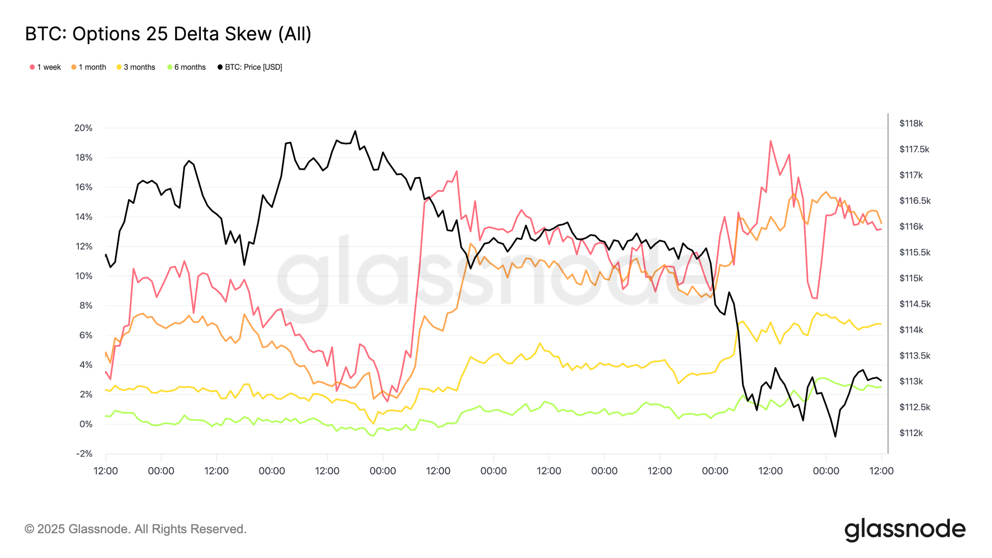 After the FOMC, BTC skew briefly approached equilibrium, with downside puts carrying little premium over calls. That calm quickly faded. On Friday, 1W skew spiked from ~1.5% to 17%, a sharp repricing that also lifted longer expiries.