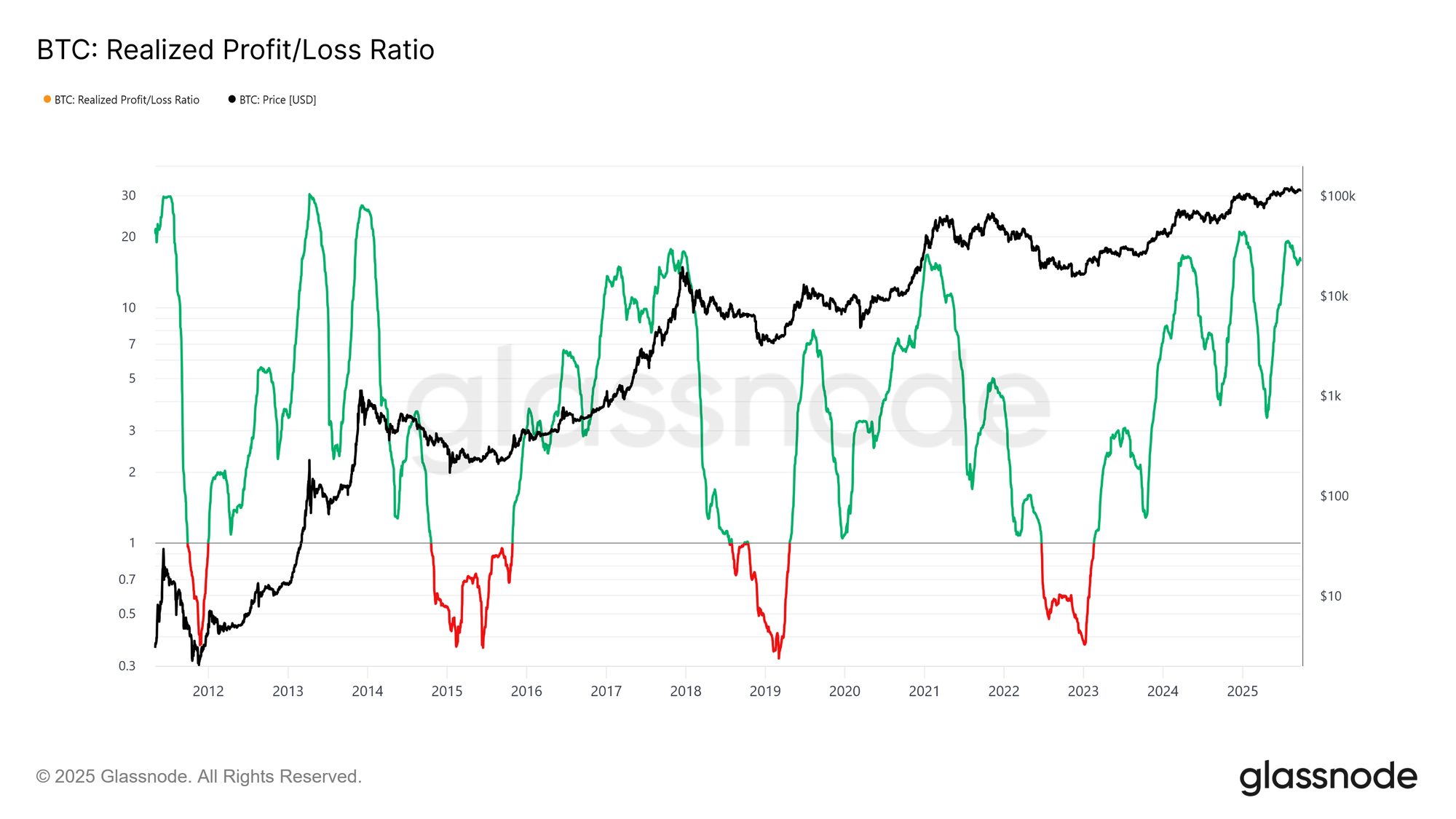 Another difference lies in the inflow structure. Unlike the single prolonged waves of earlier cycles, this cycle has seen three distinct multi-month surges. The Realized Profit/Loss Ratio shows that each time profit-taking exceeded 90% of coins moved, marking cyclical peaks. Having just stepped away from the third such extreme, probabilities favour a cooling phase ahead.