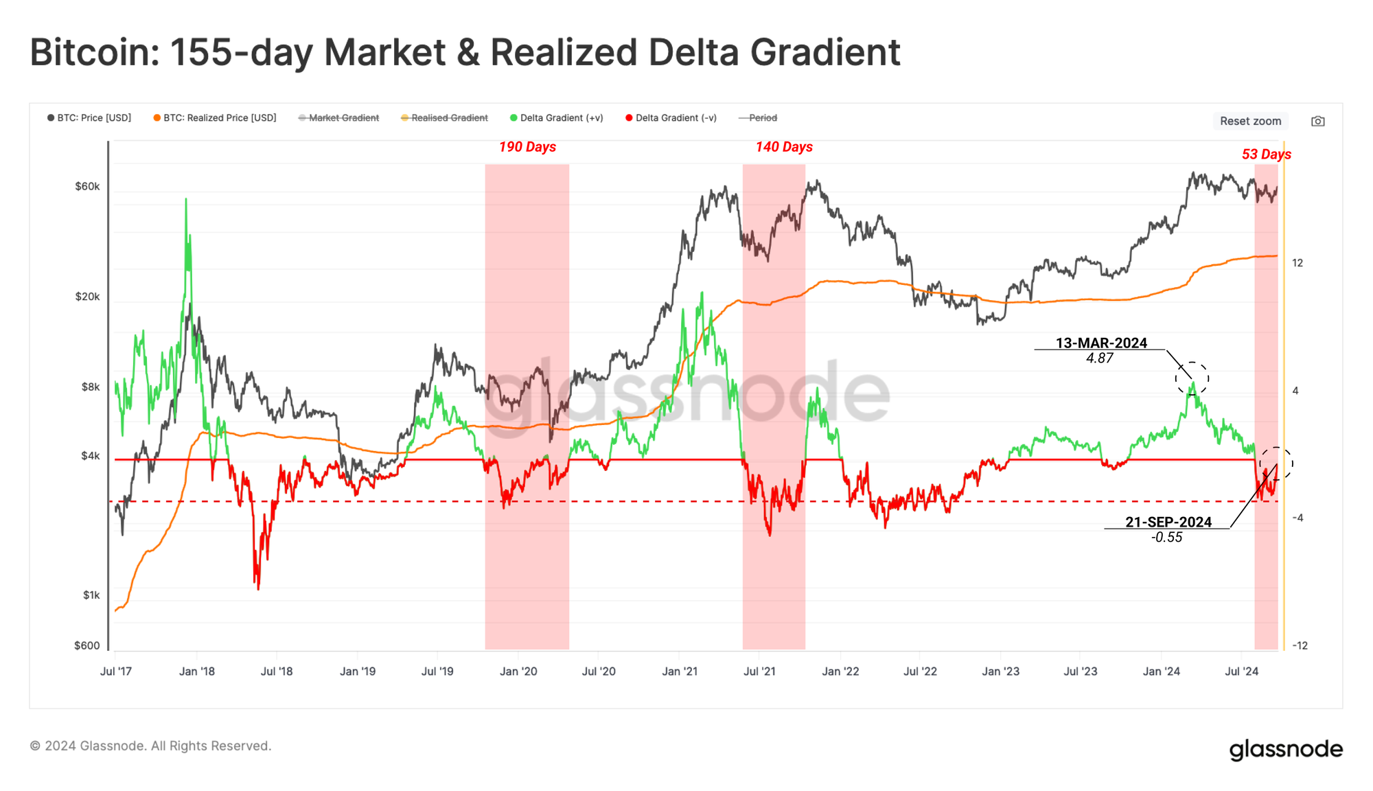 The capital inflow into the Bitcoin network slowed down after the market reached the March ATH, resulting in diminishing price momentum. This can be confirmed by comparing the smoothed 155-day gradient of Price ⬛ against that of the Realized Price 🟧.