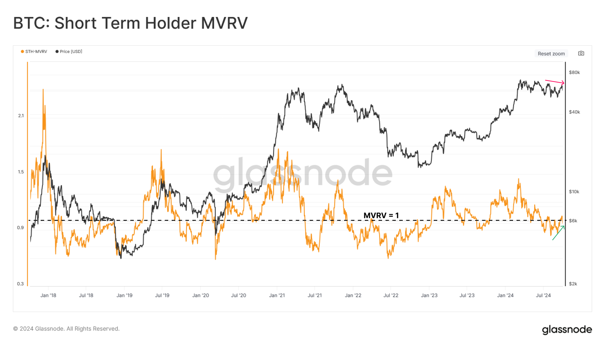 However, the depth and the duration below 1.0 is unlike that seen during previous bear market structures, such as in 2022. A slight positive divergence is also developing, where the price has generally been flat over the last month, but STH-MVRV is increasing.