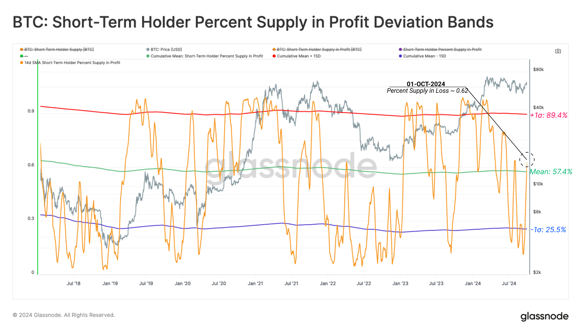 The percentage of Short-Term Holder Supply held in profit tells a similar story, with over 62% of their supply now held in a profitable position. From this, two key insights can be drawn: