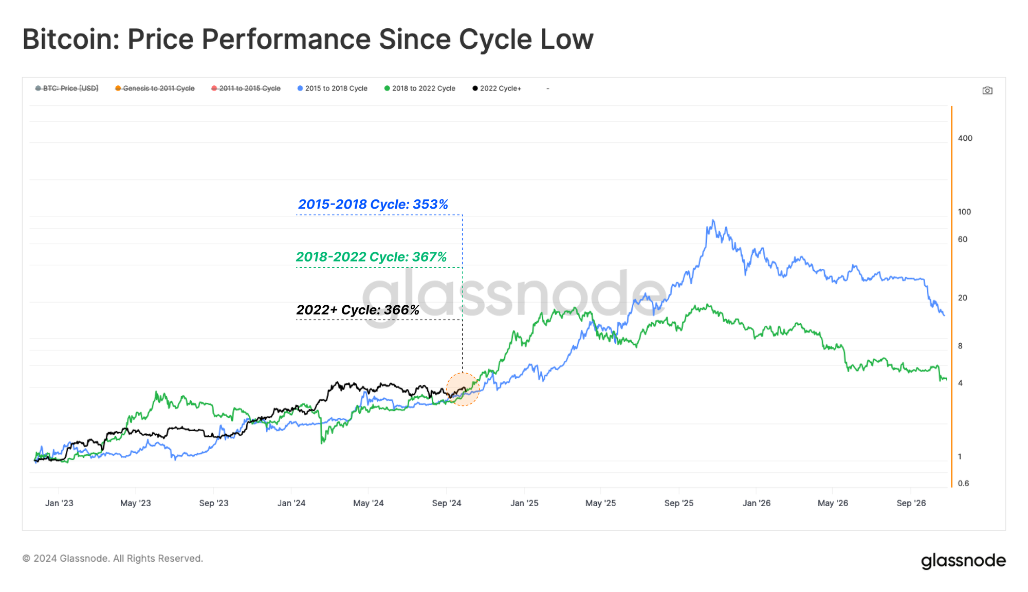 - When comparing Bitcoin’s cyclical price performance since the bear market was low, an uncanny similarity emerges over the prior three cycles, with the index trading at a nearly identical position.