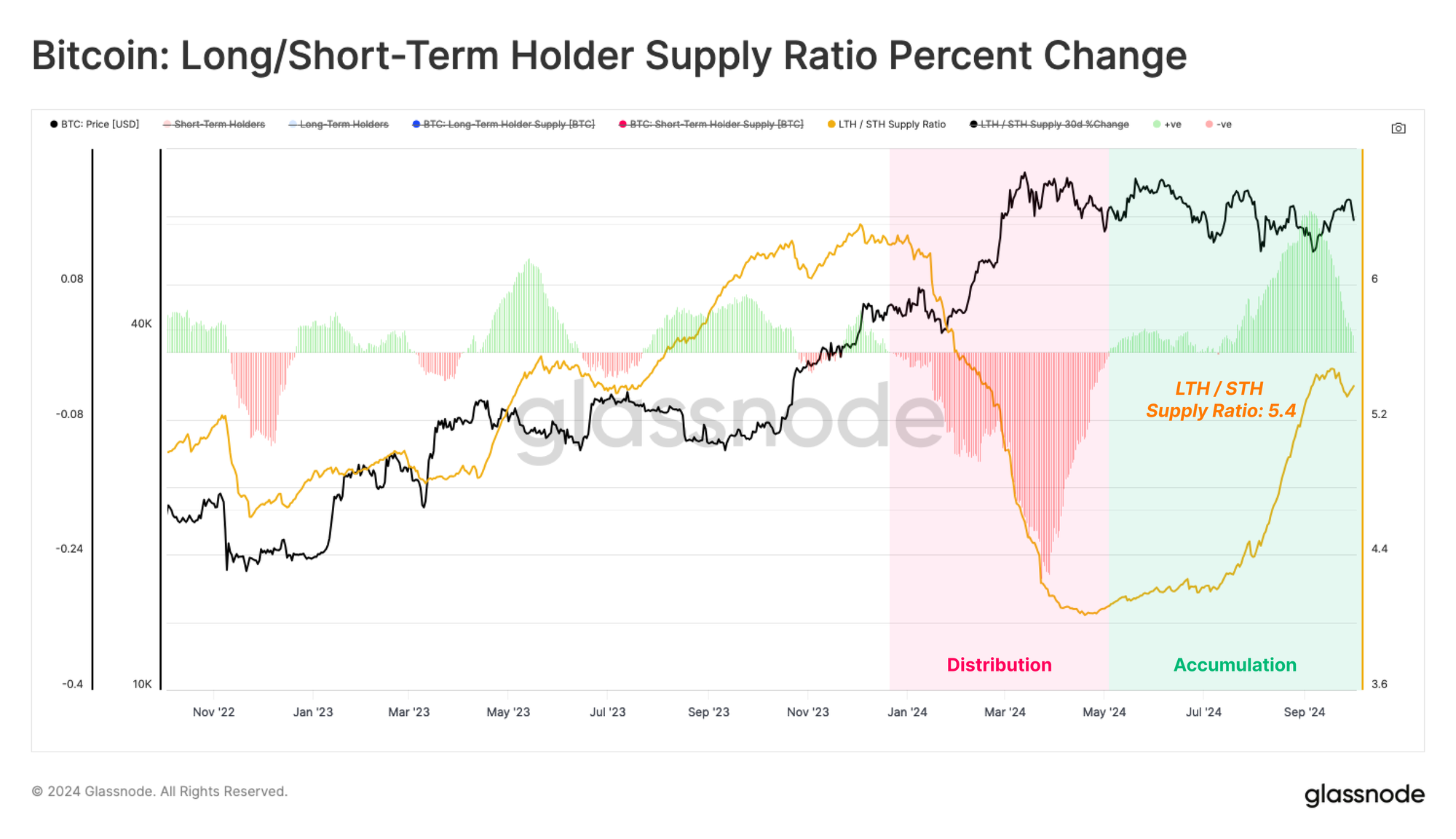 We can compare the Long/Short-Term Holder Supply Ratio to assess the balance between these cohorts. This lens shows a large volume of coins maturing into Long-Term Holder status, pushing this ratio to the highest level since mid-2021.