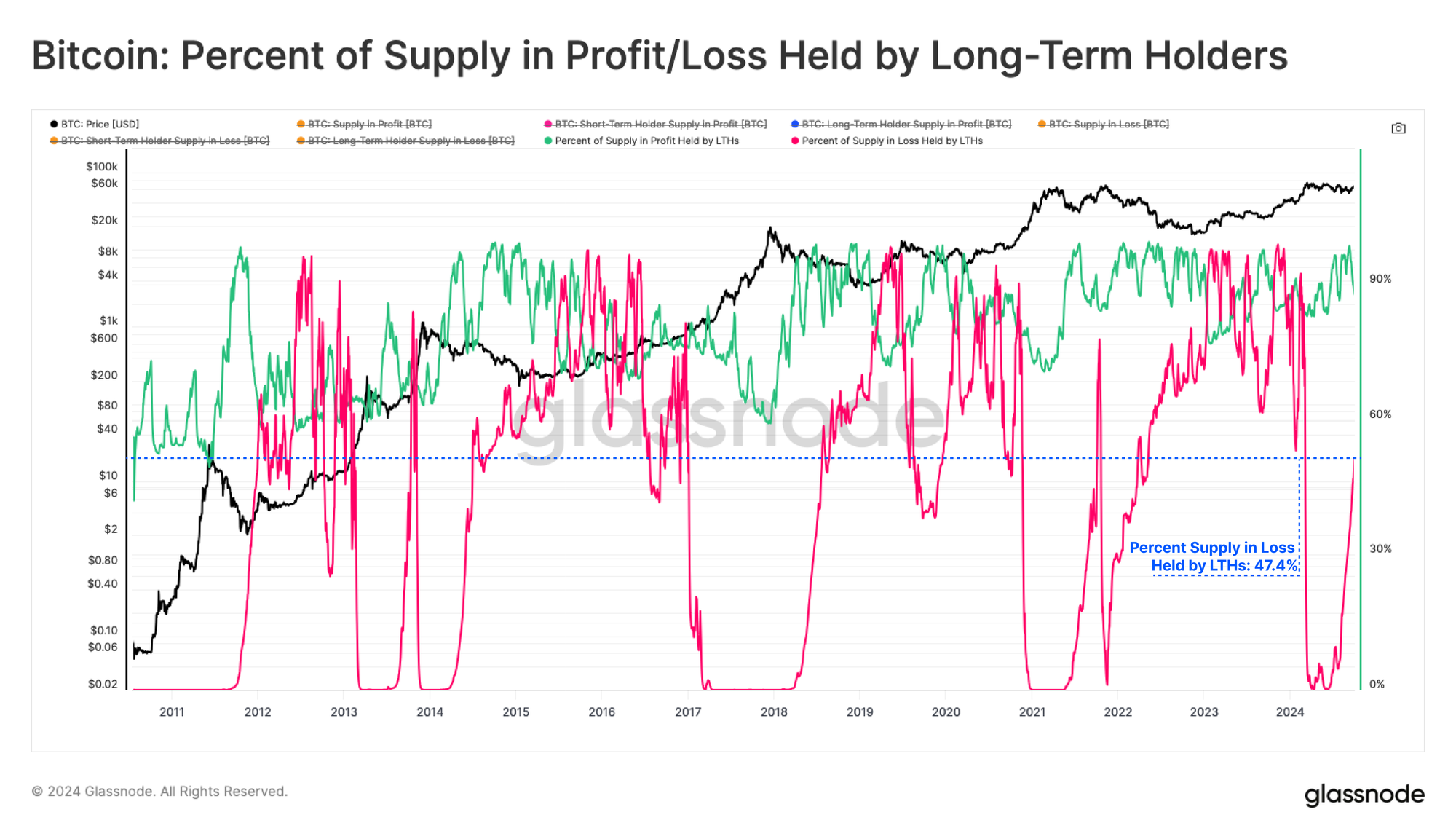 If we break down the proportion of total supply held in the loss by long-term holders, we see a surge in their dominance, with this cohort now accounting for 47.4% of all coins in the loss.