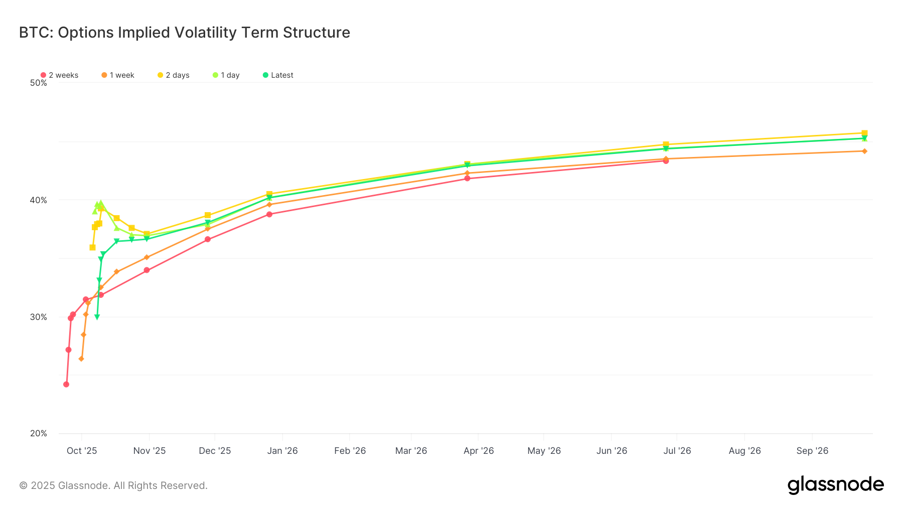 The past two weeks have brought a pronounced shift in options sentiment, as evident in the rapid adjustment in skew. What began as a deeply bearish structure turned nearly neutral by Monday, before renewed hedge demand modestly tilted the balance back toward puts.