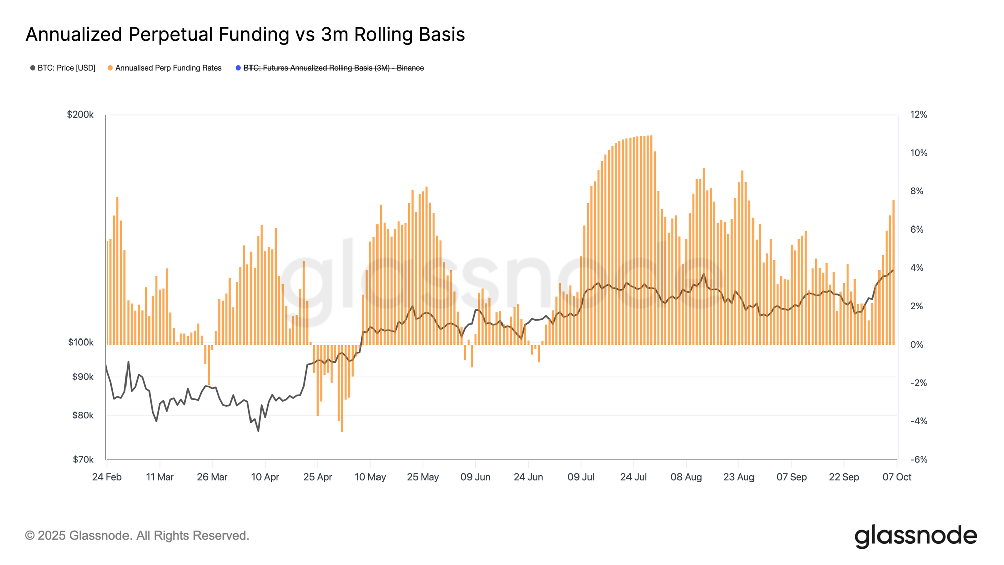 As futures open interest expands, Funding Rates have climbed in parallel with Bitcoin’s advance to new highs. Annualized funding now exceeds 8%, signalling elevated demand for leveraged long exposure and a rise in speculative activity.