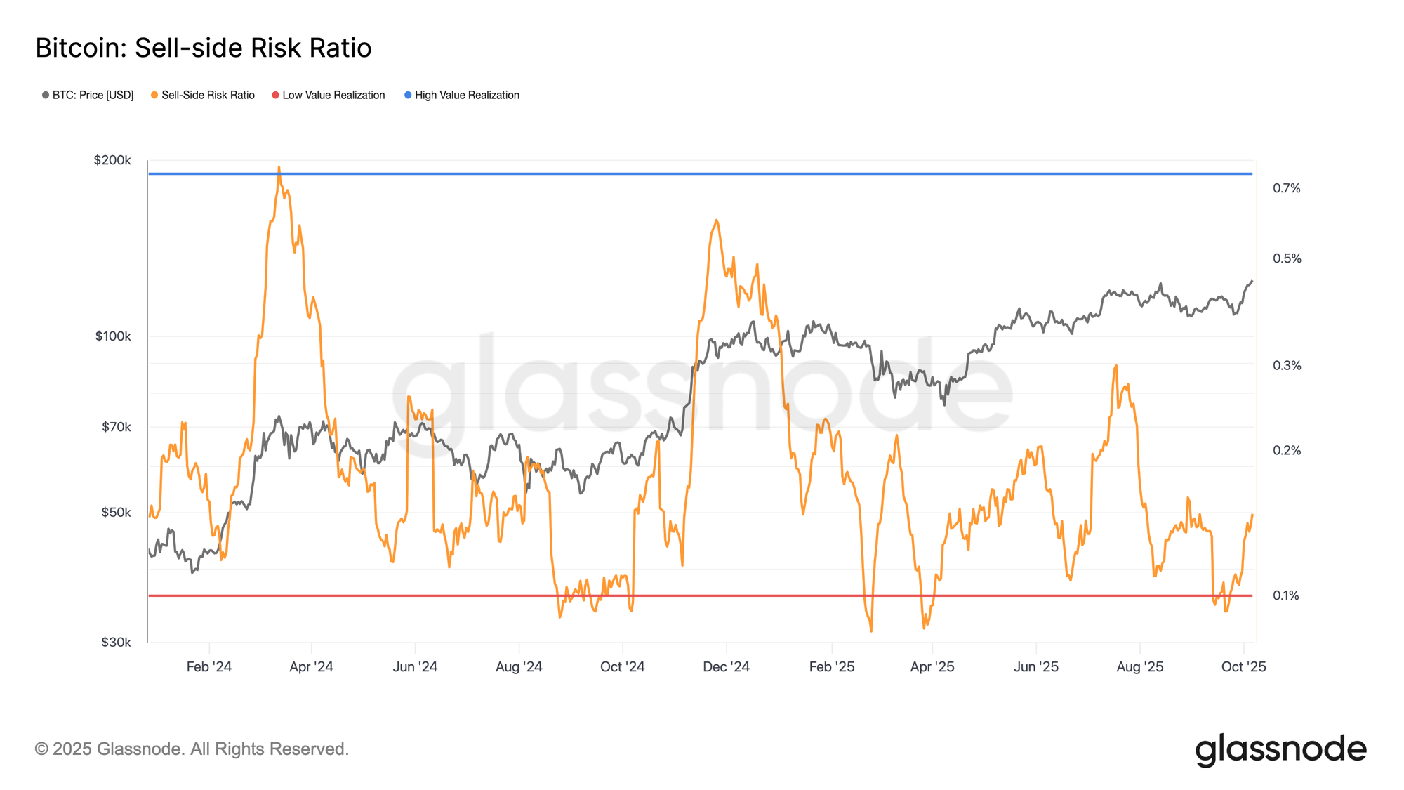 As Bitcoin enters a price discovery phase, assessing the degree of profit realization helps gauge whether the rally remains sustainable. The Sell-Side Risk Ratio, which measures the value of realized profits and losses relative to total realized value, serves as a proxy for investors’ willingness to spend their coins.
