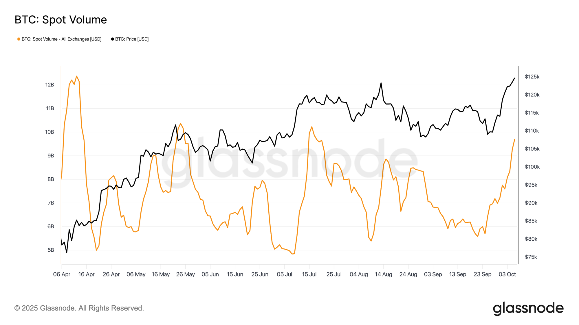 - Bitcoin has broken to new all-time highs near $126K, driven by renewed spot demand and record ETF inflows exceeding $2.2B. The surge in institutional participation has lifted both price and market activity, with spot volumes reaching multi-month highs as Q4 begins.
