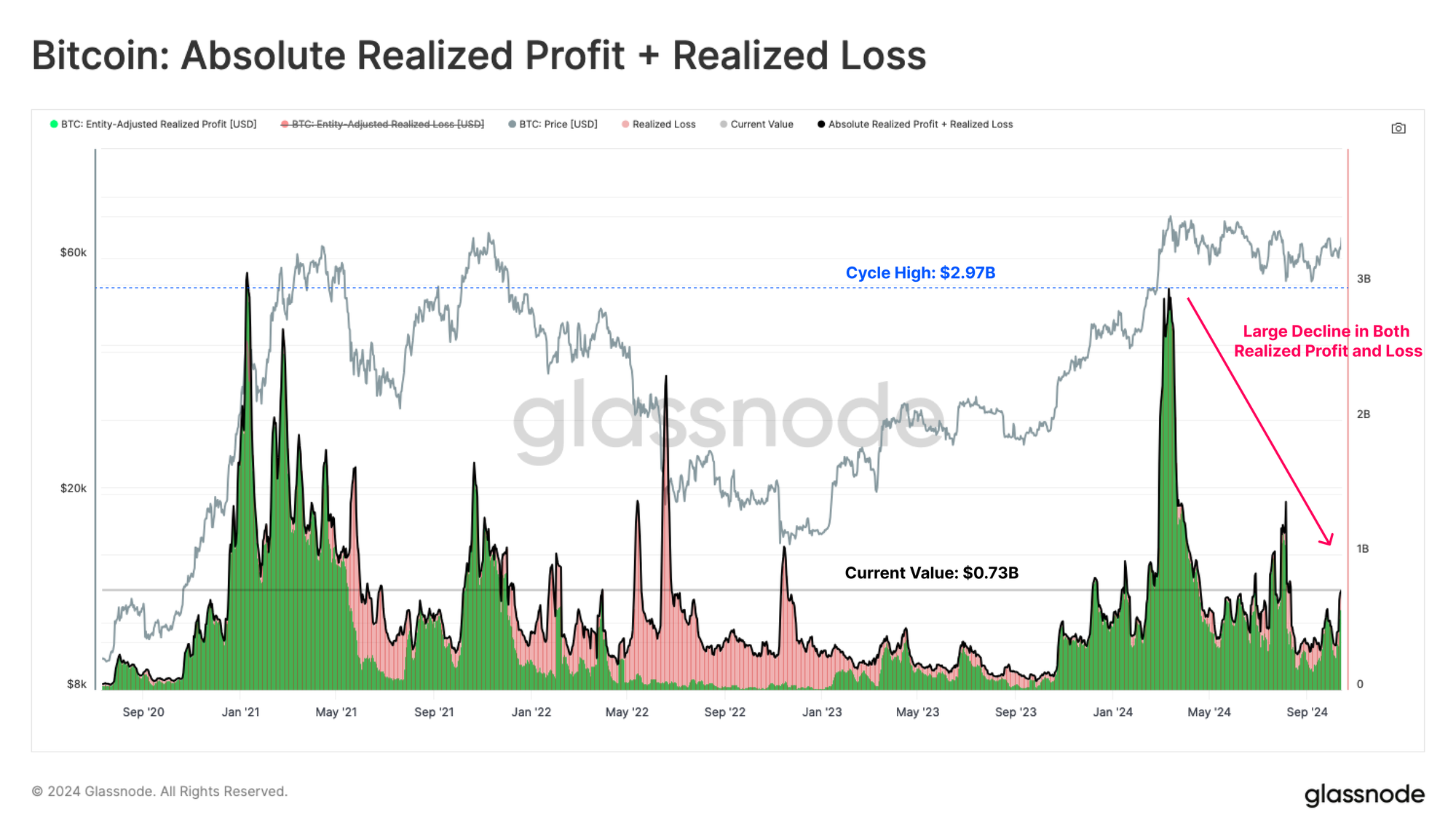 The rate of new capital inflows has continued to wane since the $73k ATH, set in March 2024. Due to the peer-to-peer nature of the Bitcoin network, buyers and sellers are matched on a 1-1 basis. Thus, measuring the Realized Profit or Realized Loss metrics can act as proxies for the magnitude of new capital entering or exiting the network.