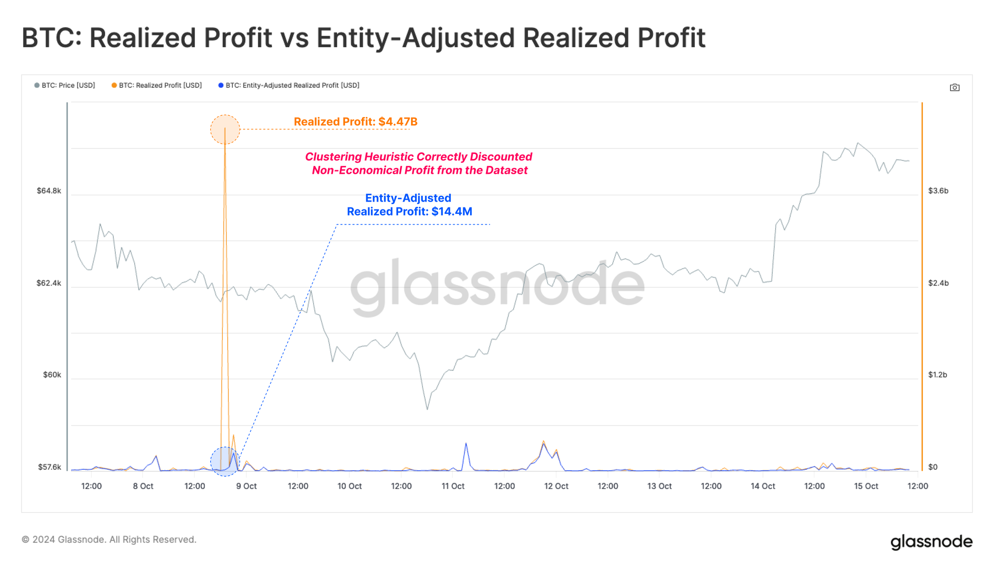 An interesting significant spike in Realized Profit can be seen on 8-Oct within the raw, unfiltered variant of this metric. However, the same spike does not show up when looking at the Entity-Adjusted variant pioneered by Glassnode.