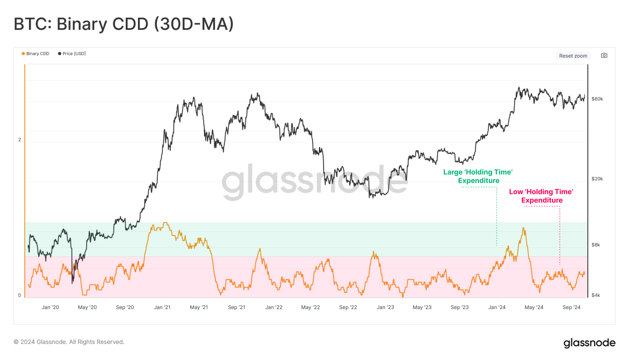 Returning to our demand-side assessment, we can use the Binary CDD metric as another proxy for demand-side pressure. This metric tracks the expenditure of ‘holding time’ in the market, tracking when holders of old supply transact large volumes (balanced by new buyers entering).