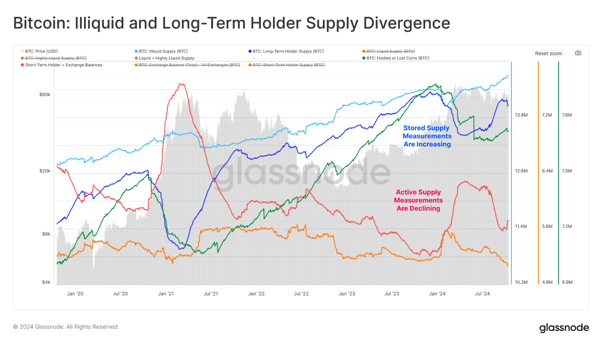 The chart below profiles several measures of ‘available supply,’ including Short-Term Holder and Highly Liquid supply. We compare these against measures of ‘saved or stored supply’ such as Long-Term Holder or Vaulted supply.