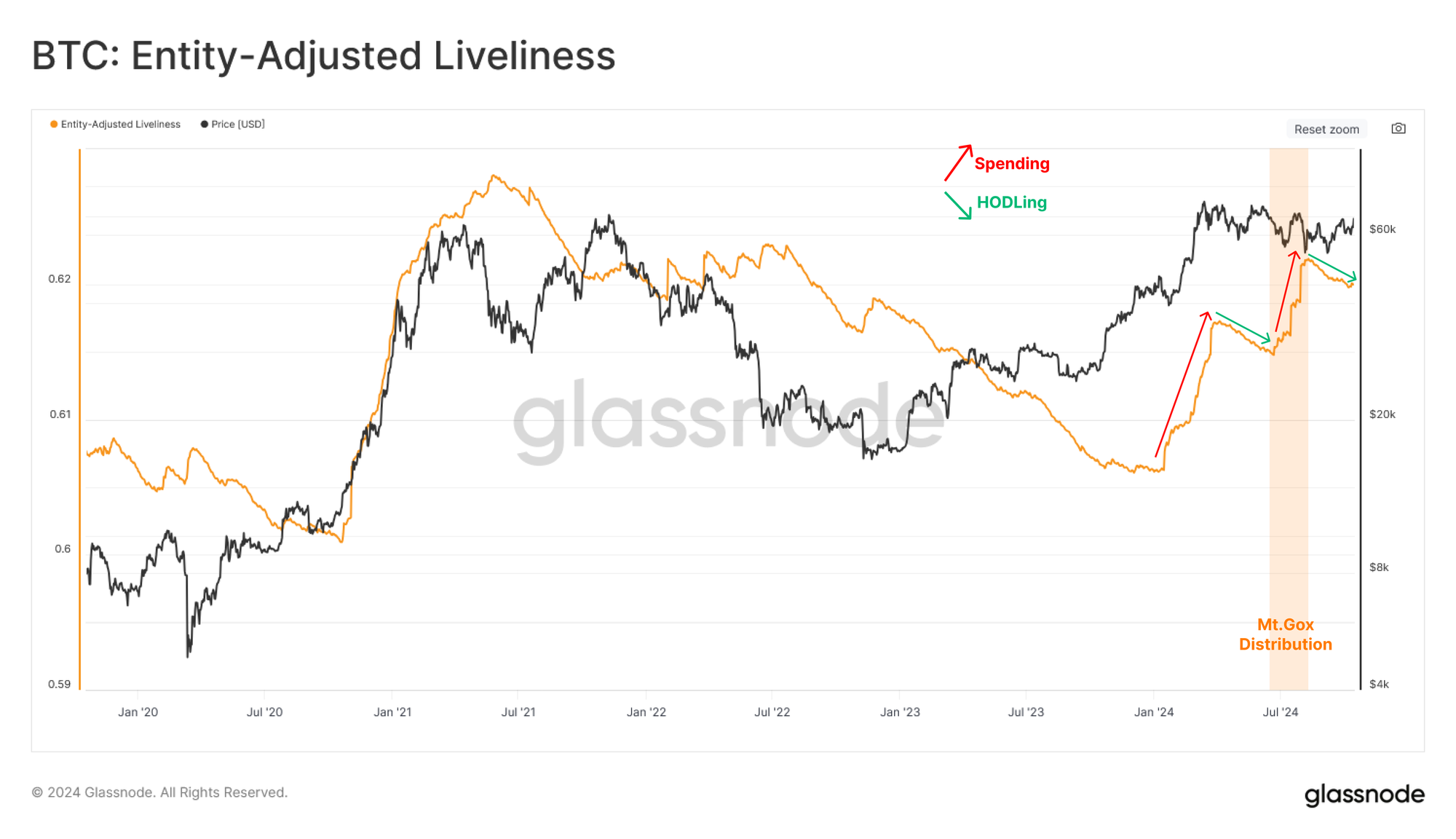 The liveliness metric is currently within a sustained downtrend, highlighting a solid preference by market participants to HODL their supply, which further constricts our available supply measures.