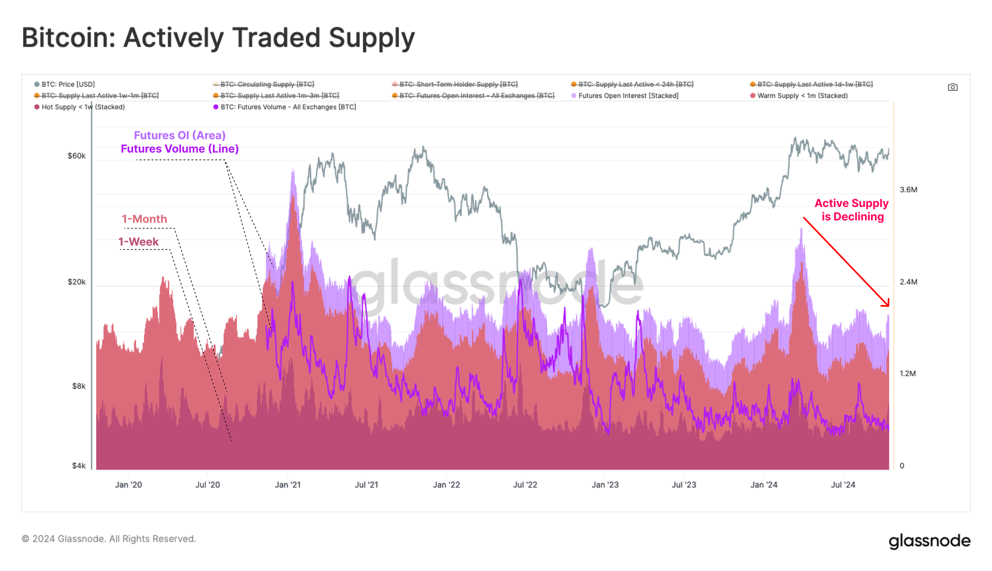 Combined, this active supply measure has effectively halved since the March ATH. This suggests that low trade volumes on-chain and a reduction in Futures market activity highlight a net decline in investor speculation and attention.