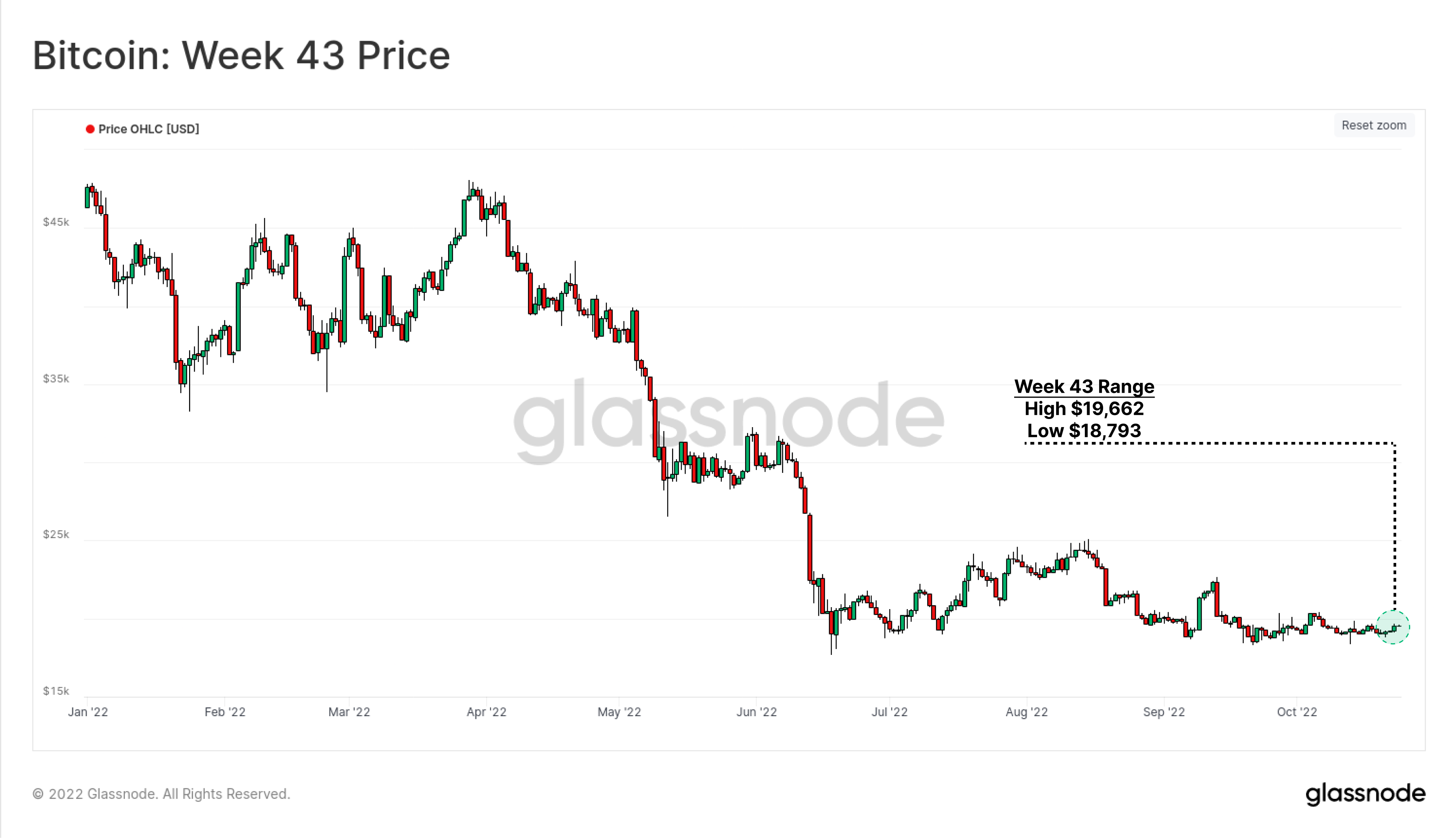 The volatility of Bitcoin markets have come to resemble those of a stablecoin, trading within an incredibly small $869 range. Just 4.6% separates the weekly low of $18,793 from the high of $19,662.