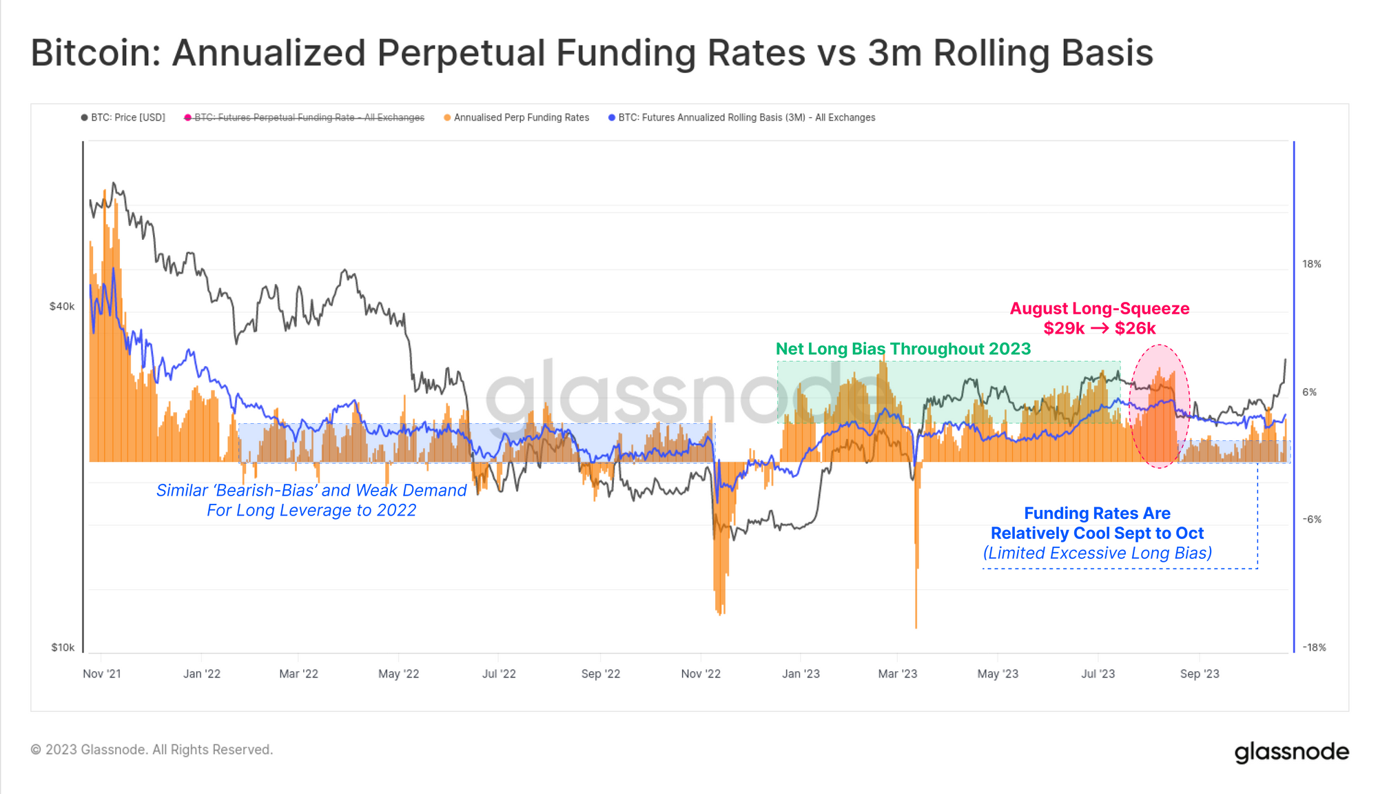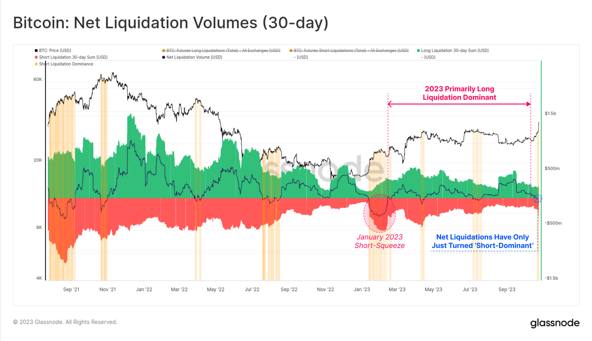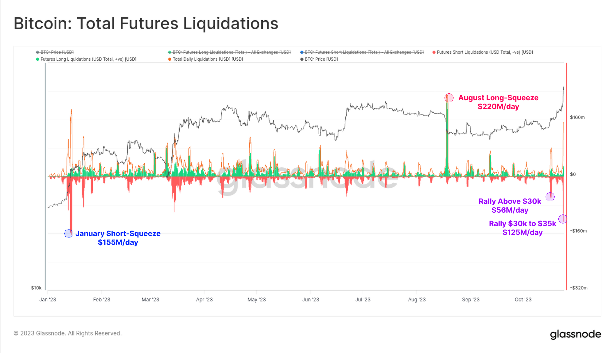 Approximately $56M in short positions were liquidated when the rally kicked off on 17-Oct, and followed by an additional $125M on 23-Oct. This is a meaningful short liquidation volume within the context of 2023. It is again comparable to the $155M in short liquidations in January and the $220M in long positions closed in August.