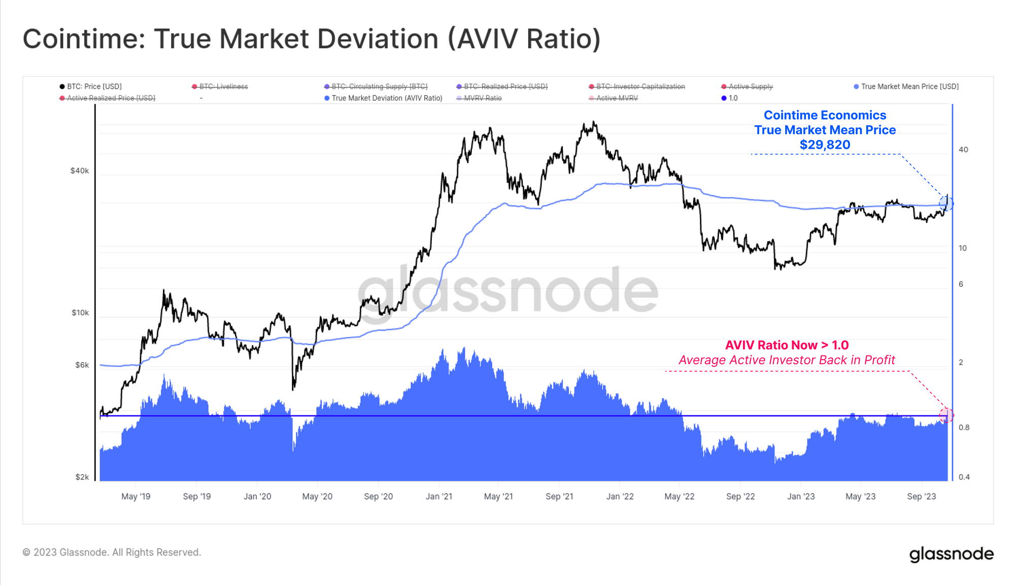 With the market having cleared the 2020-22 cycle mid-point (see WoC 28), as well as trading above the True Market Mean Price, this puts the average active BTC investor back into an unrealized profit.