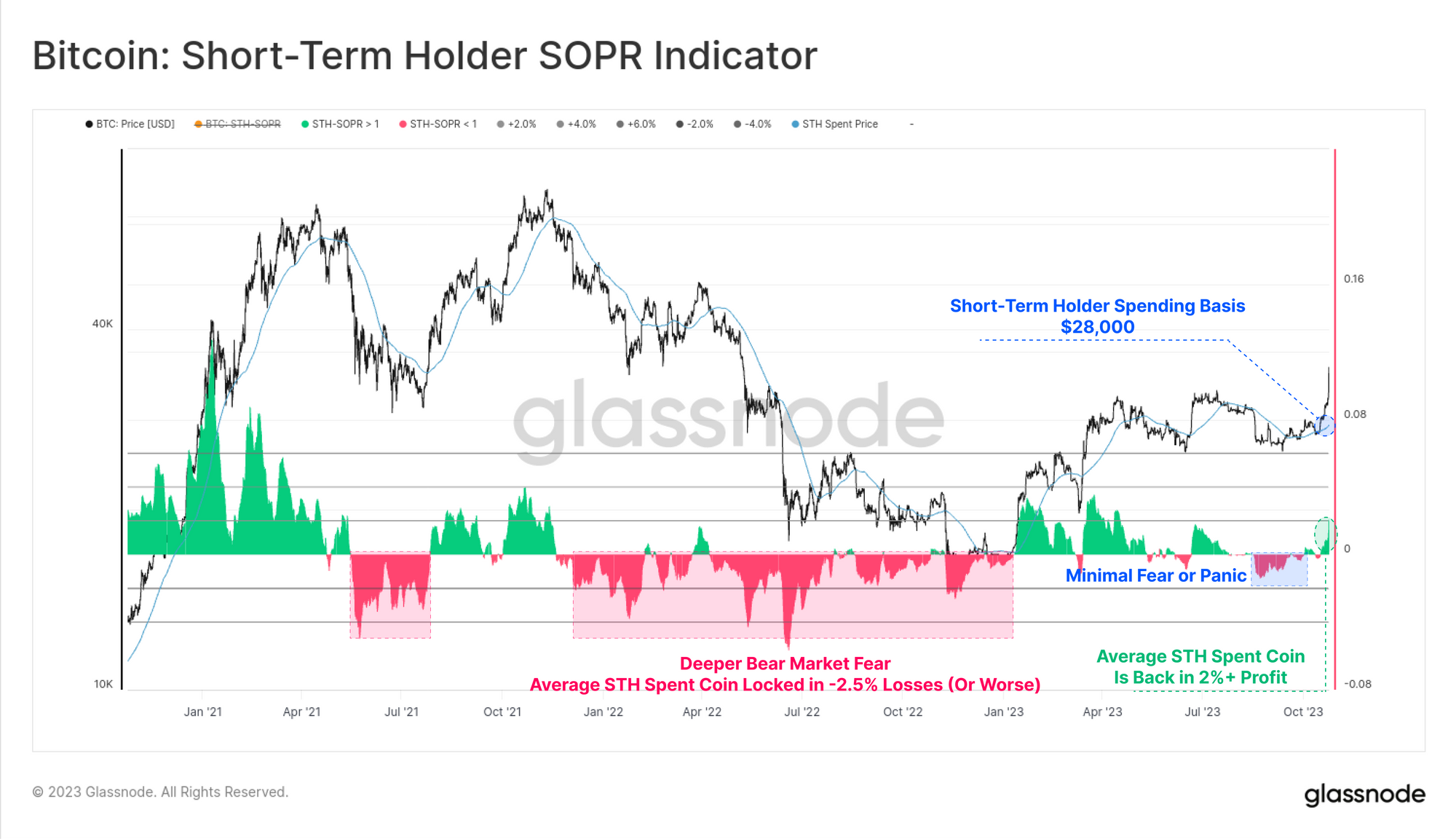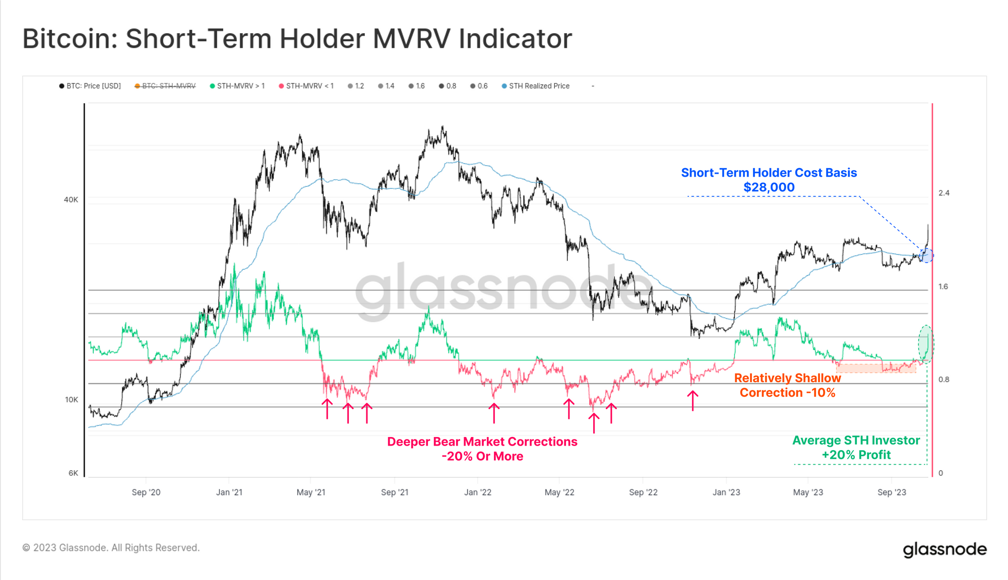 The Short-Term Holder (STH) cost basis is also now in the rear view mirror at $28k, putting the average recent investor into an average profit of +20%. The chart below shows the STH-MVRV Ratio, where red denotes periods where the market traded below the STH cost basis, and green above it.