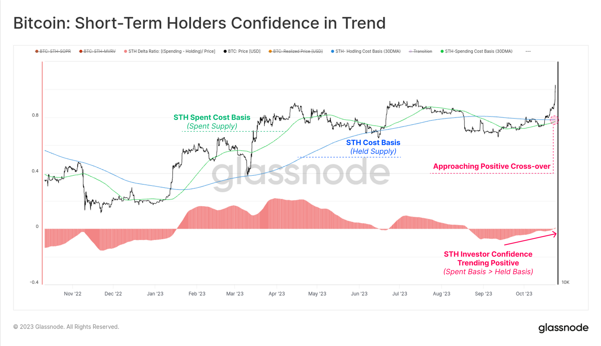 If we bring these two cost basis models together, we can establish an oscillator that tracks the trend of Short-Term Holder confidence (explored further in WoC 38).