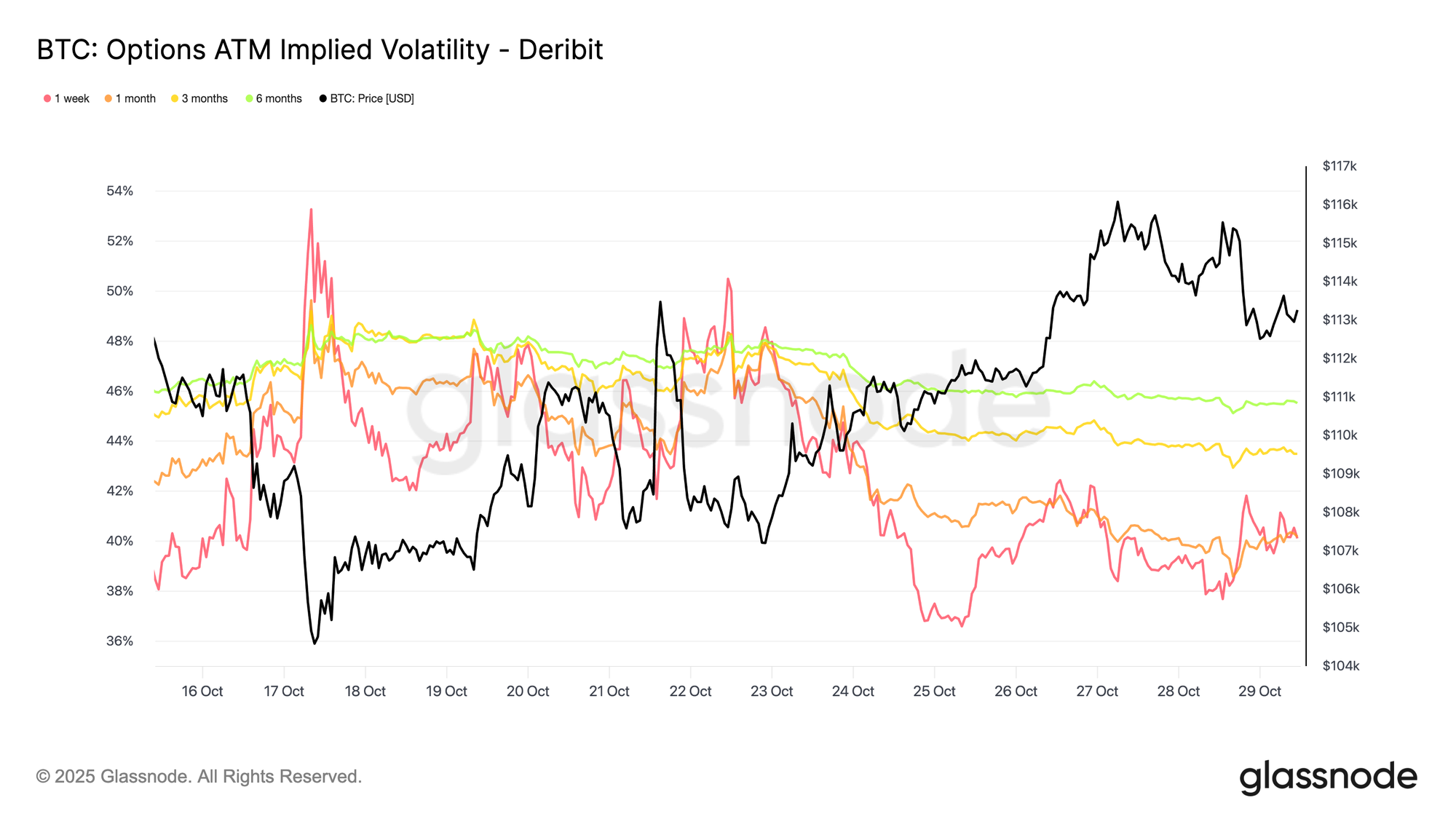 Shorter-dated maturities have seen the largest adjustment, with 1-week at-the-money implied volatility dropping over 10 vol points to around 40%, while 1-month to 6-month tenors slipped only 1–2 points, holding near the mid-40s. This flattening of the term structure suggests traders expect fewer near-term shocks.