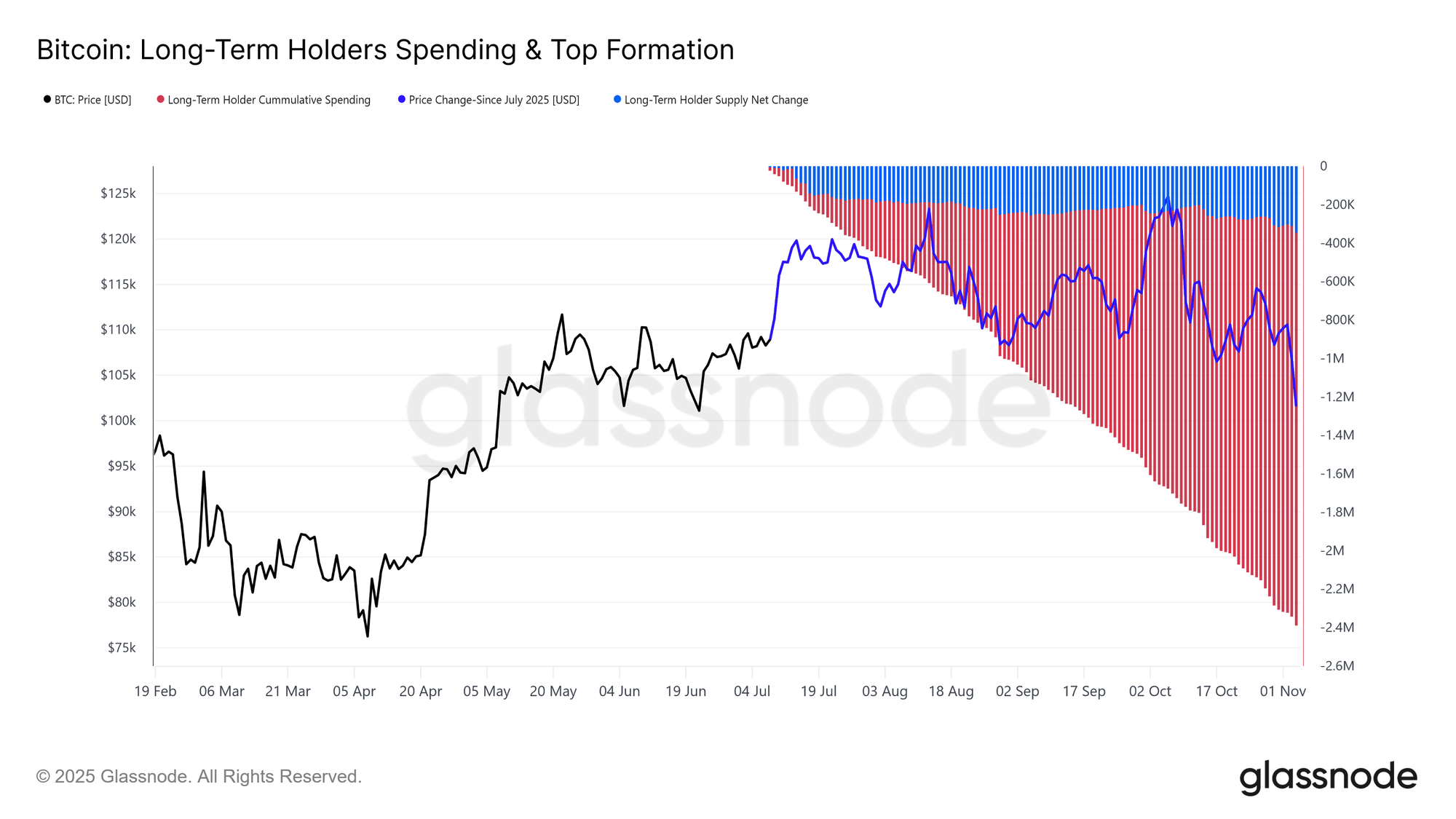 Despite the relatively contained loss intensity and a moderate 21% drawdown from the all-time high of $126K, the market remains under quiet yet persistent sell pressure from long-term holders (LTHs). This trend has been unfolding since July 2025, even as Bitcoin reached a new peak in early October, catching many by surprise.