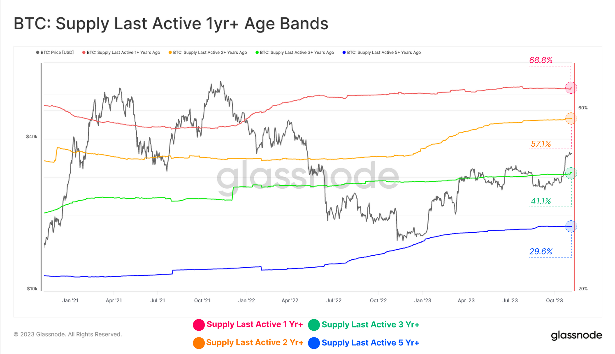 This metric speaks to an aggregate maturation of the BTC supply, as investors accumulate and hold onto their coins, refraining from spending and transacting at an increasing rate.