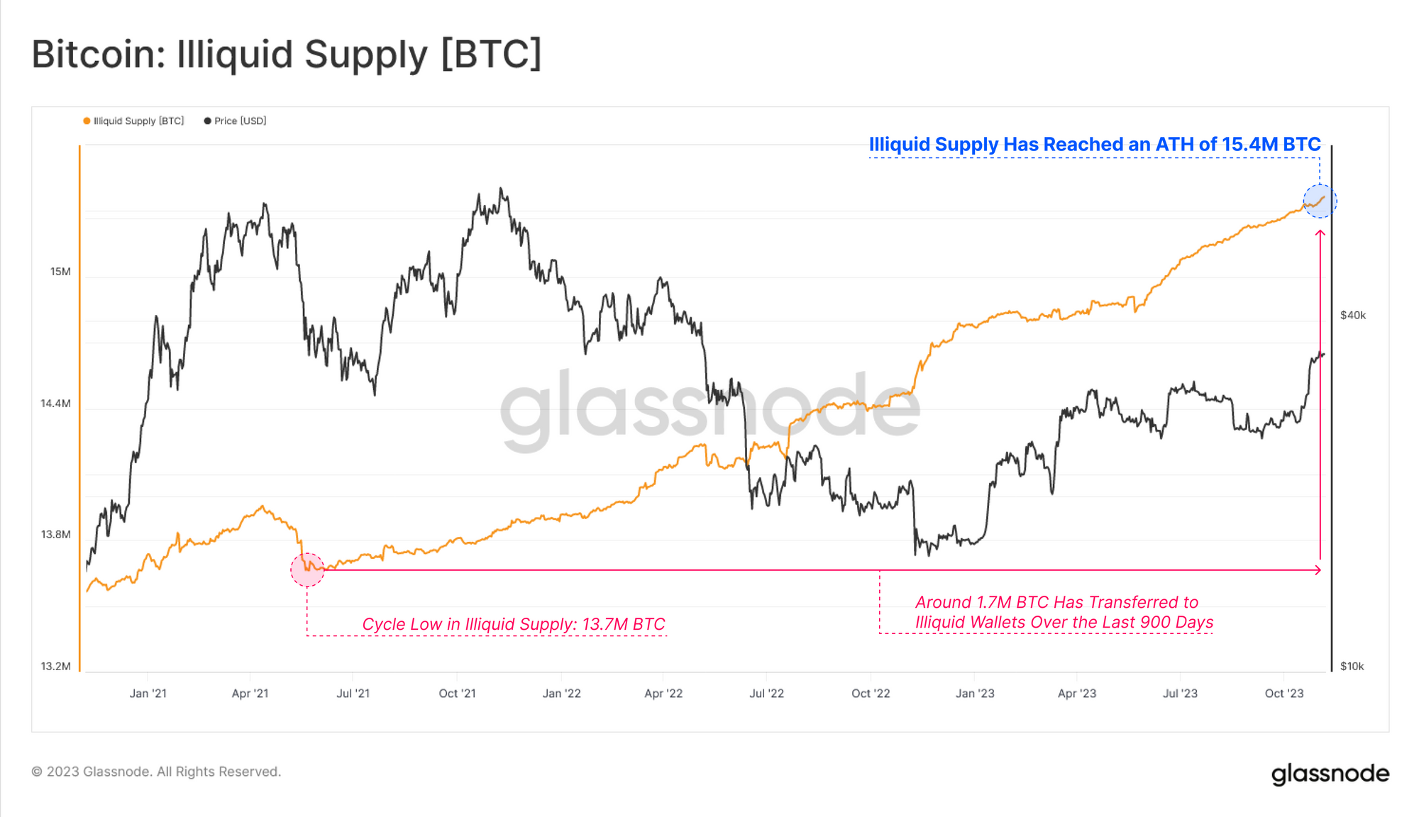 The Illiquid Supply metric, which measures the amount of supply held in wallets with minimal history of spending is also at an ATH of 15.4M BTC. Changes in Illiquid Supply often move in tandem with exchange withdrawals, suggesting investors continue to withdraw their coins into custody, with over 1.7M BTC doing so since May 2021.