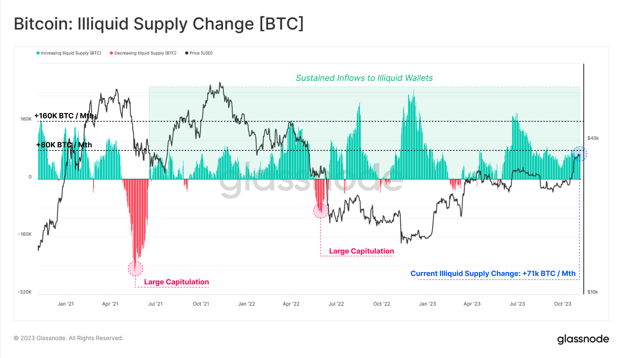 This is reflected in the monthly rate of change for Illiquid Supply which is within a multi-year period of net increase, currently increasing at a rate of +71k BTC per month.