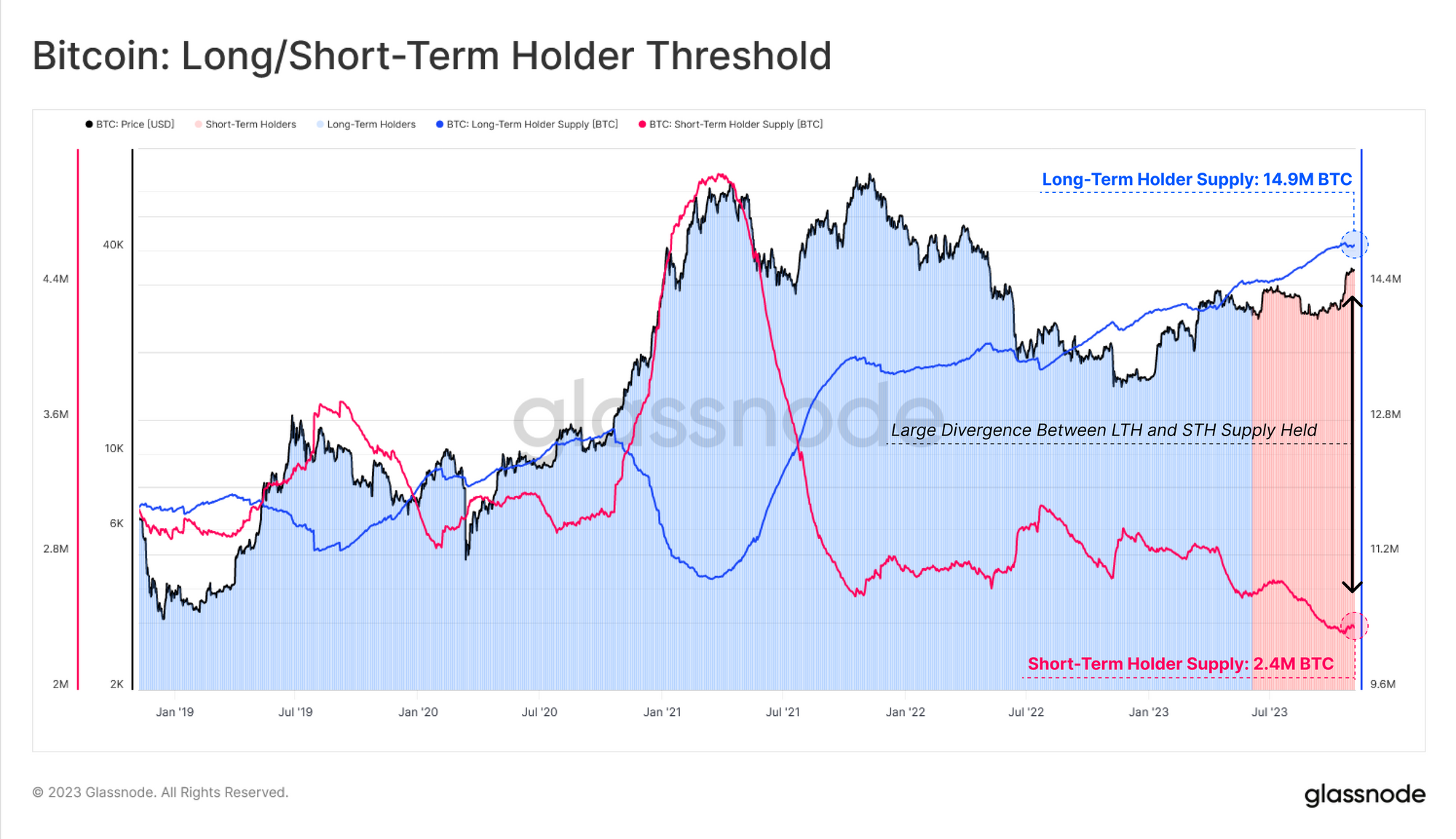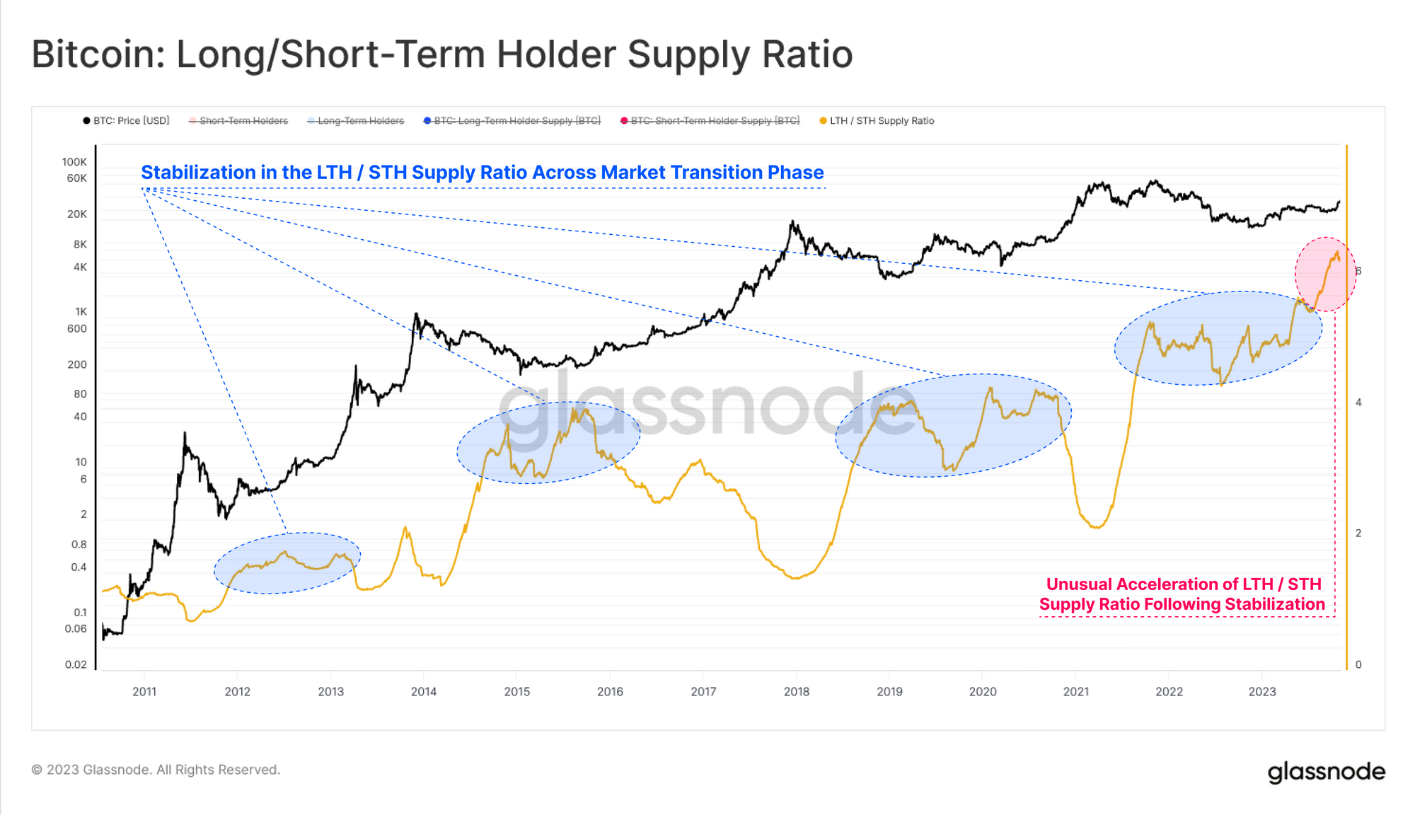 If we take a ratio between Long and Short-Term Holder supply, we can see that it has broken out to new highs since July 2023. This clearly shows the magnitude of the divergence between dormant and mobile supply, and highlights an impressive tightness.