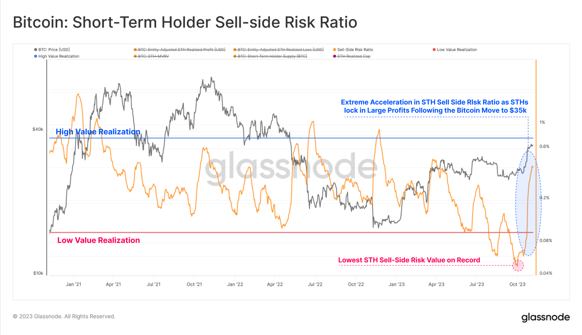 In this instance, we consider only the Short-Term Holder cohort as they are one of the primary drivers of day-to-day price action. Following the recent rally to $35k, the Sell-Side Risk Ratio spiked from historical lows, suggesting a ‘re-awakening’ of many young coins. This speaks to a near-term profit taking event by this cohort.