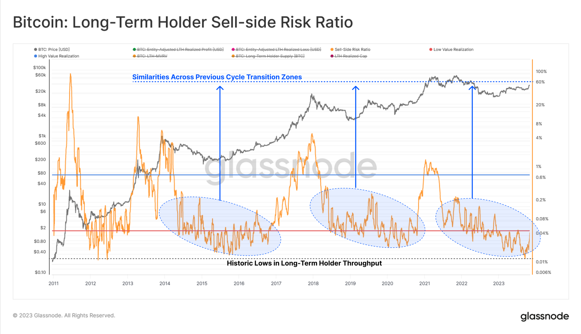 For the Long-Term Holder cohort however, their Sell-Side Risk ratio has increased slightly, yet remains extremely low in a historical context. This metric currently has a similar structure to the 2016 and late 2020 eras, which were similar periods of tight overall BTC supply.
