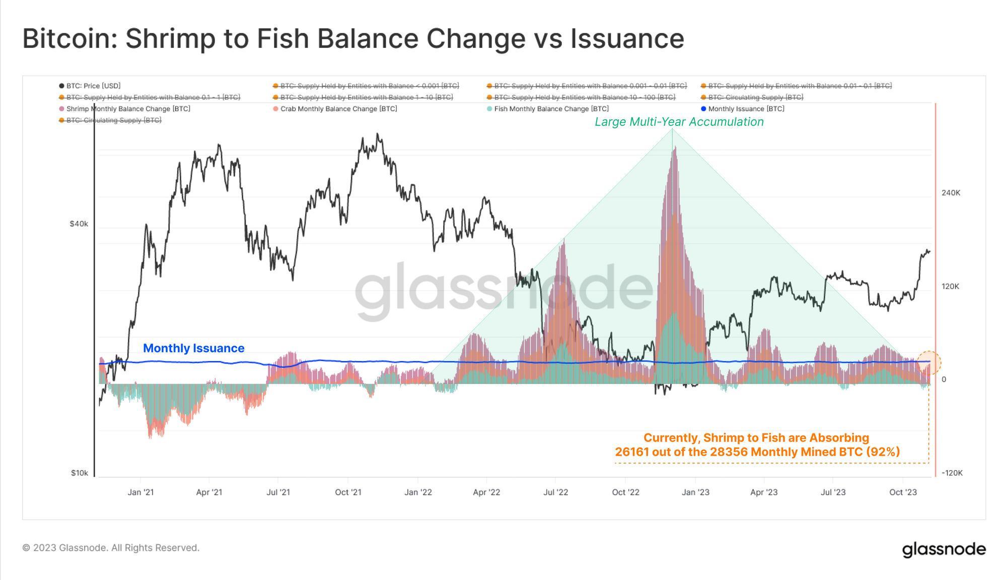 If we isolate only entities on the smaller end of the scale such as Shrimps (<1 BTC), Crabs (1-10 BTC) and Fish (10-100 BTC), we can see their accumulation pattern is quite significant. The combined rate of balance increase for this sub-group is currently equivalent to 92% of newly mined supply, and has remained in an elevated state since May 2022.