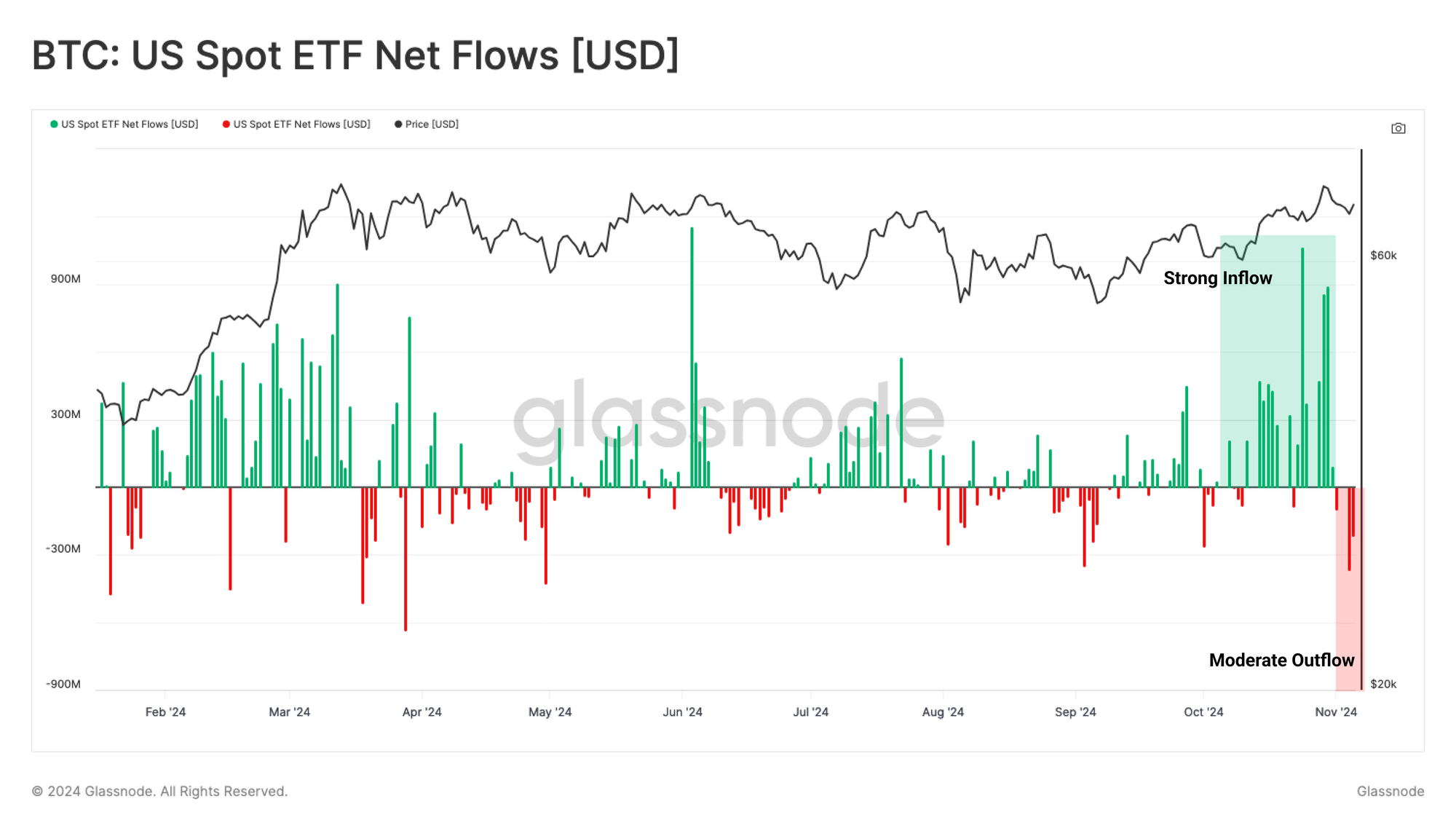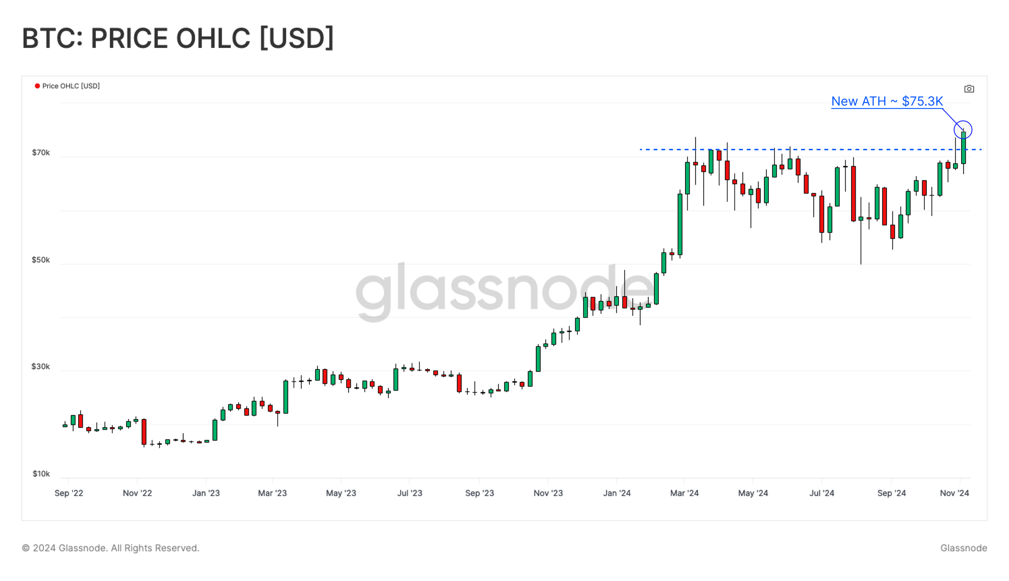 In the aftermath of the US presidential election, Bitcoin reached a new all-time high, trading above $75,000 for the first time this week. This move is supported by modest capital inflows of $2.5B/month, indicating the potential for further growth amidst a consistent influx of new demand.