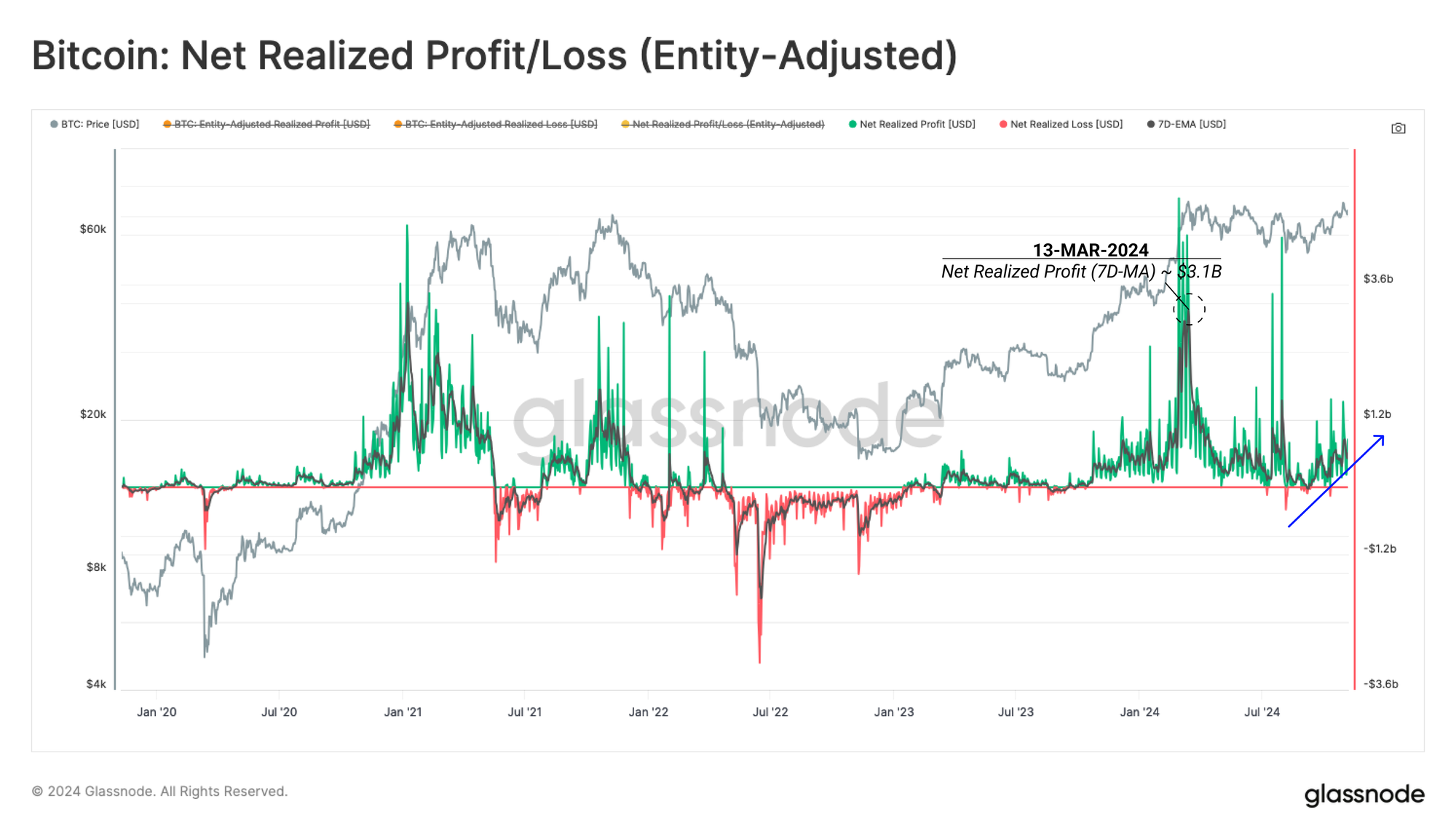 - Profit-taking activities have seen a non-trivial increase, while losses realized remain negligible. However, both values are relatively modest compared to volumes seen around market extremes.